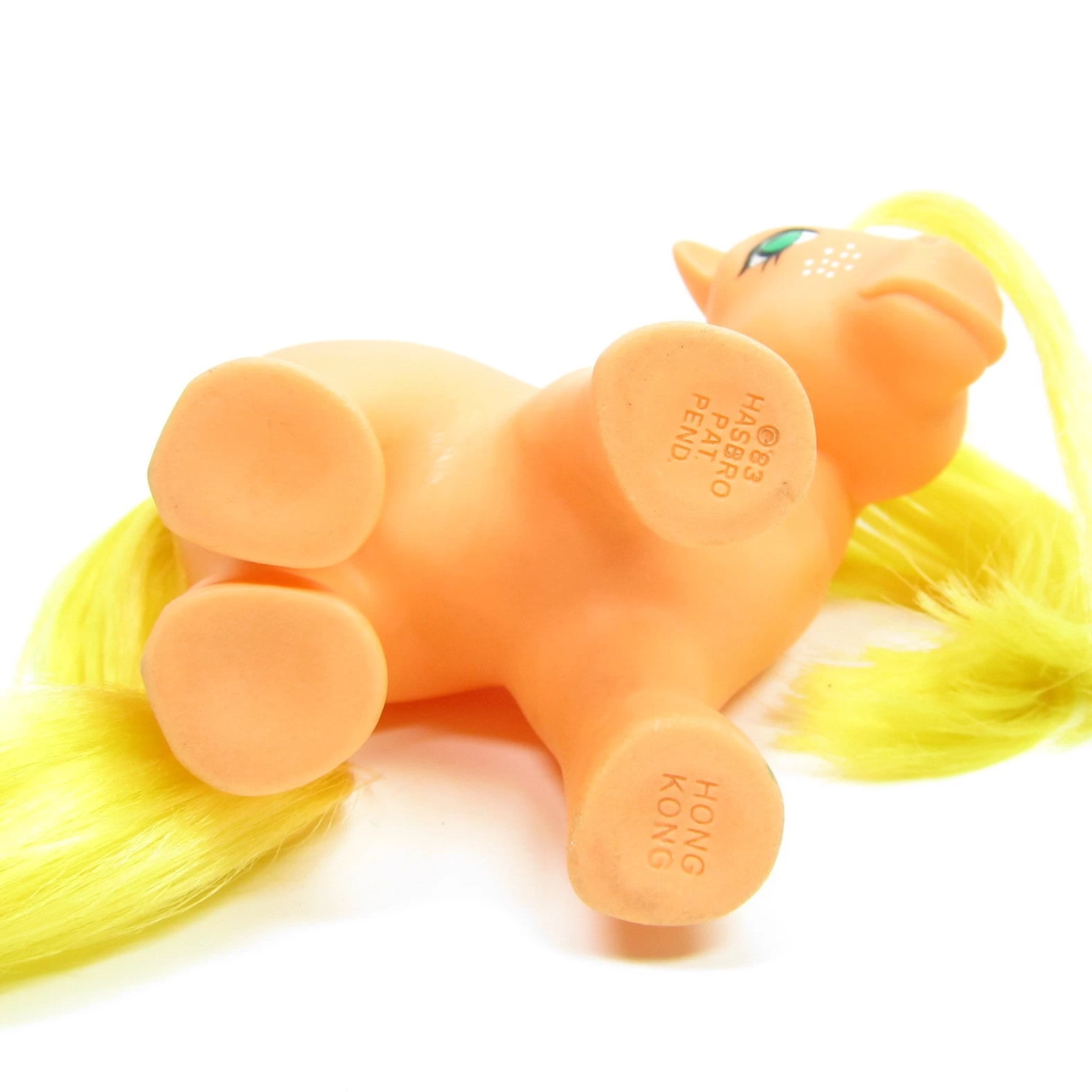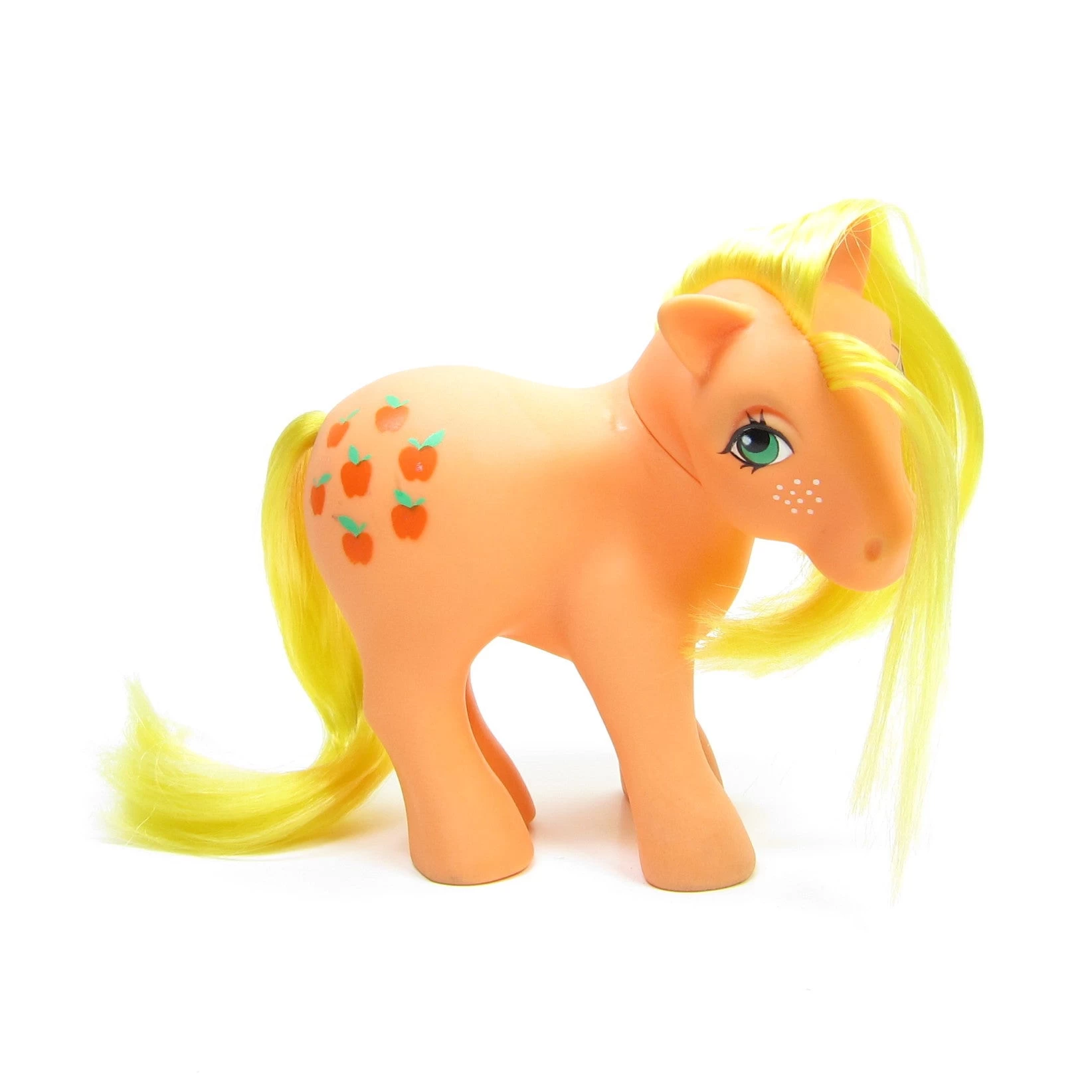 This vintage G1 My Little Pony is Applejack. She’s orange with yellow hair and white freckles on her face. Her symbol is 7 red apples with green leaves. This version of her was released in Year 3Â and has longer hair than the Year 2Â version.