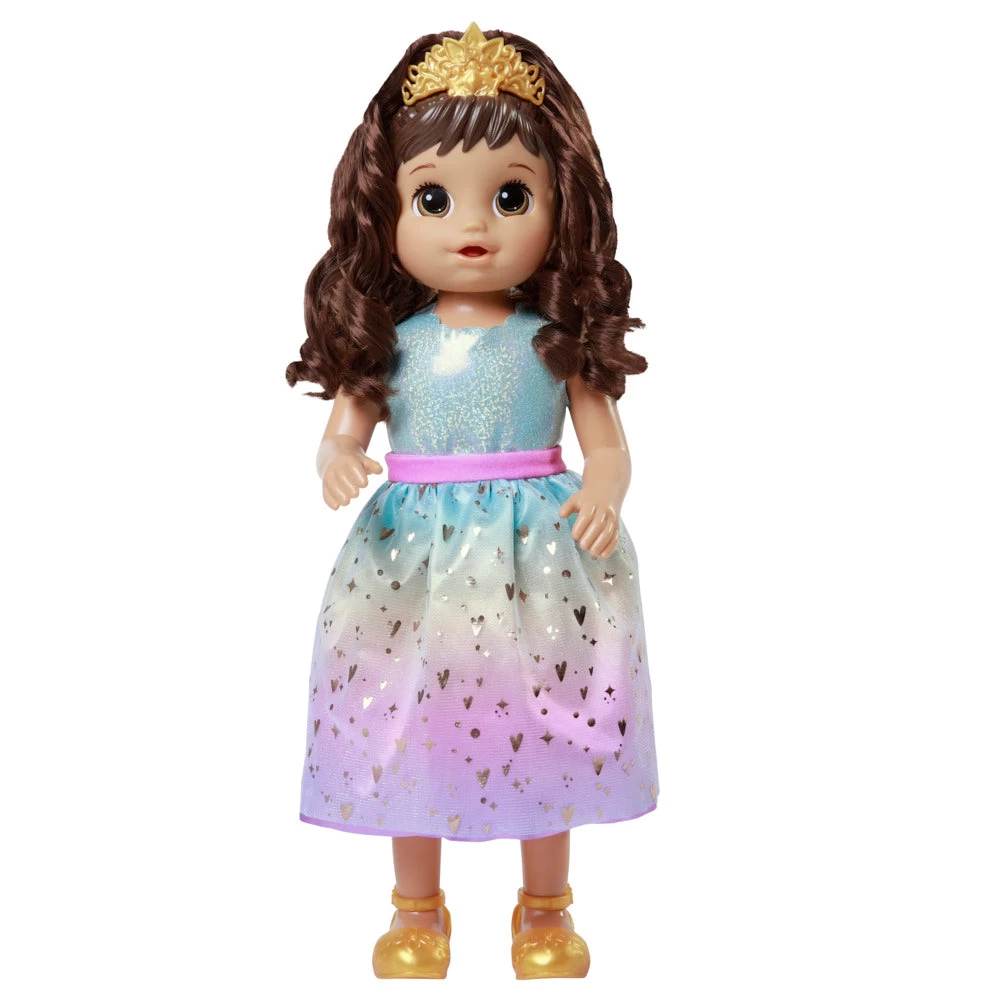 •DRESS-UP DOLL ACCESSORIES AND TIARA HAIR EXTENSION: Kids ages 3 and up can place tiara on baby doll’s head and style her brushable hair. Complete the royal transformation with her shimmery princess skirt