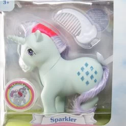 This vintage G1 My Little Pony is Baby Brother Sweet Celebrations, he’s one of the Loving Family Ponies from Year 7. Baby Brother Sweet Celebrations is a light blue earth pony with light blue eyes and teal and pink hair. His symbols are presents and balloons and are a combination of the symbols from the mommy and daddy ponies from this line. His symbols cover the sides of his body, similar to the Twice As Fancy Ponies.