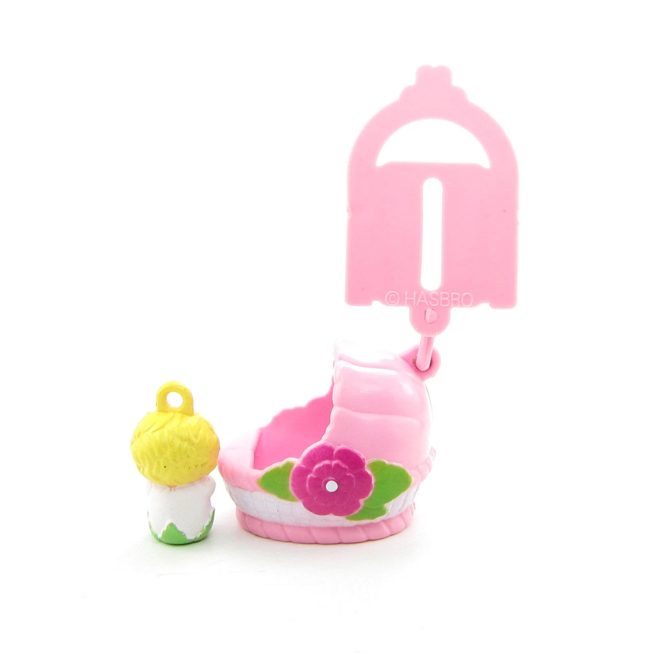 This vintage Charmkins set is Baby Sunshine with her bassinet. It includes three separate pieces. There’s a pink button hanger, a pink bassinet with a dark pink flower, and the sweet little Baby Sunshine charm.