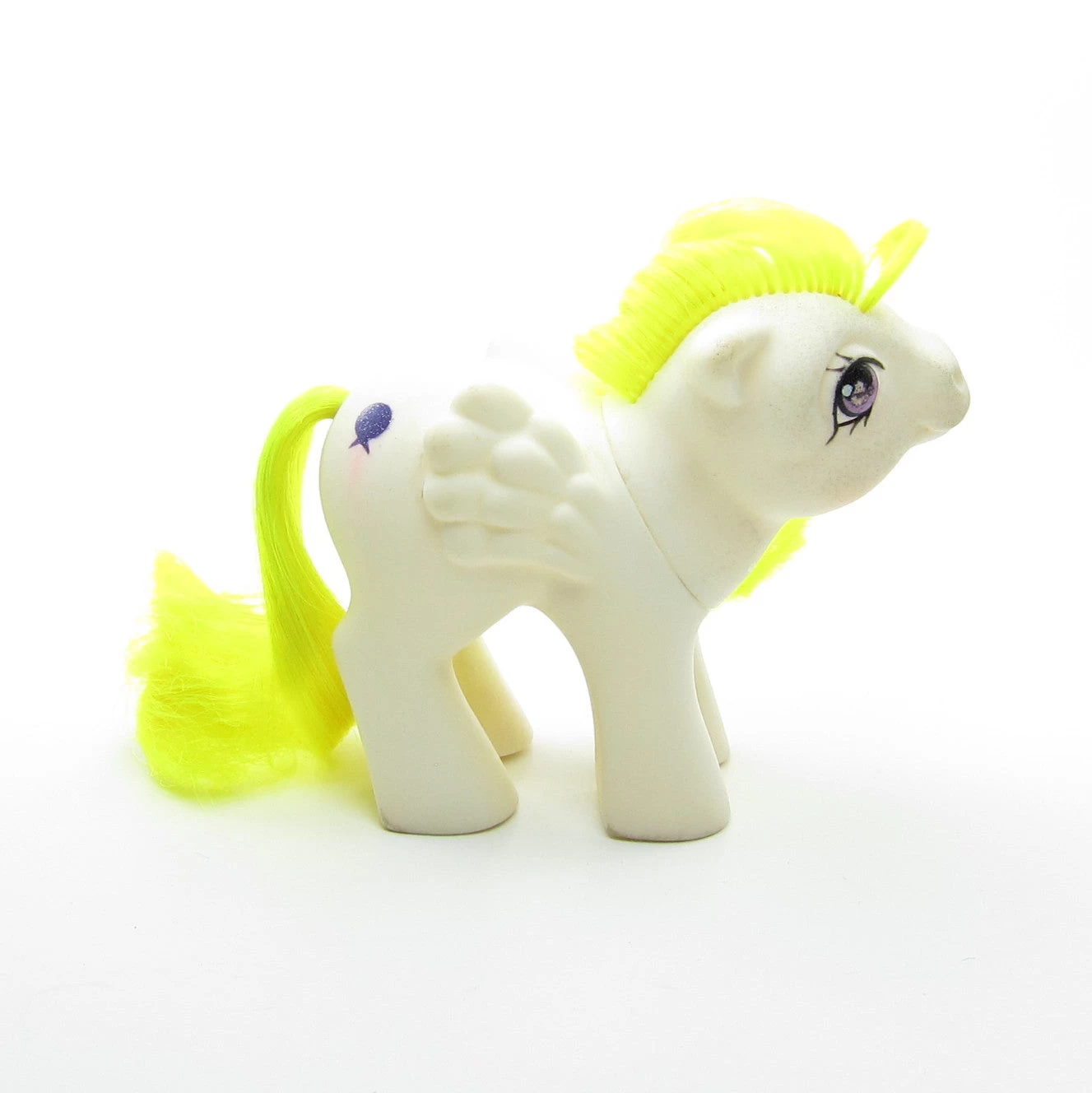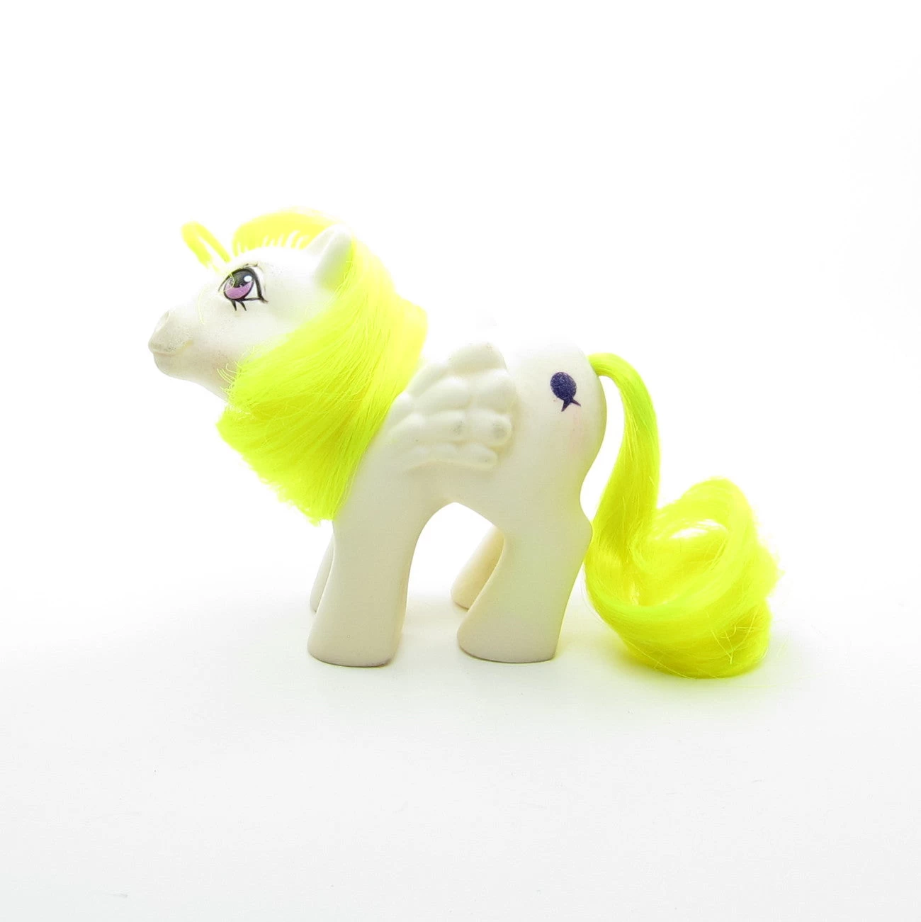 This vintage My Little Pony is Baby Surprise, she’s a white pegasus with neon yellow hair. She has purple eyes and her symbol is a glittery purple balloon with a pink string. Her head is tilted upward, which gives her a sweet and innocent expression. Baby Surprise was released in Year 3 in the first line of baby ponies.