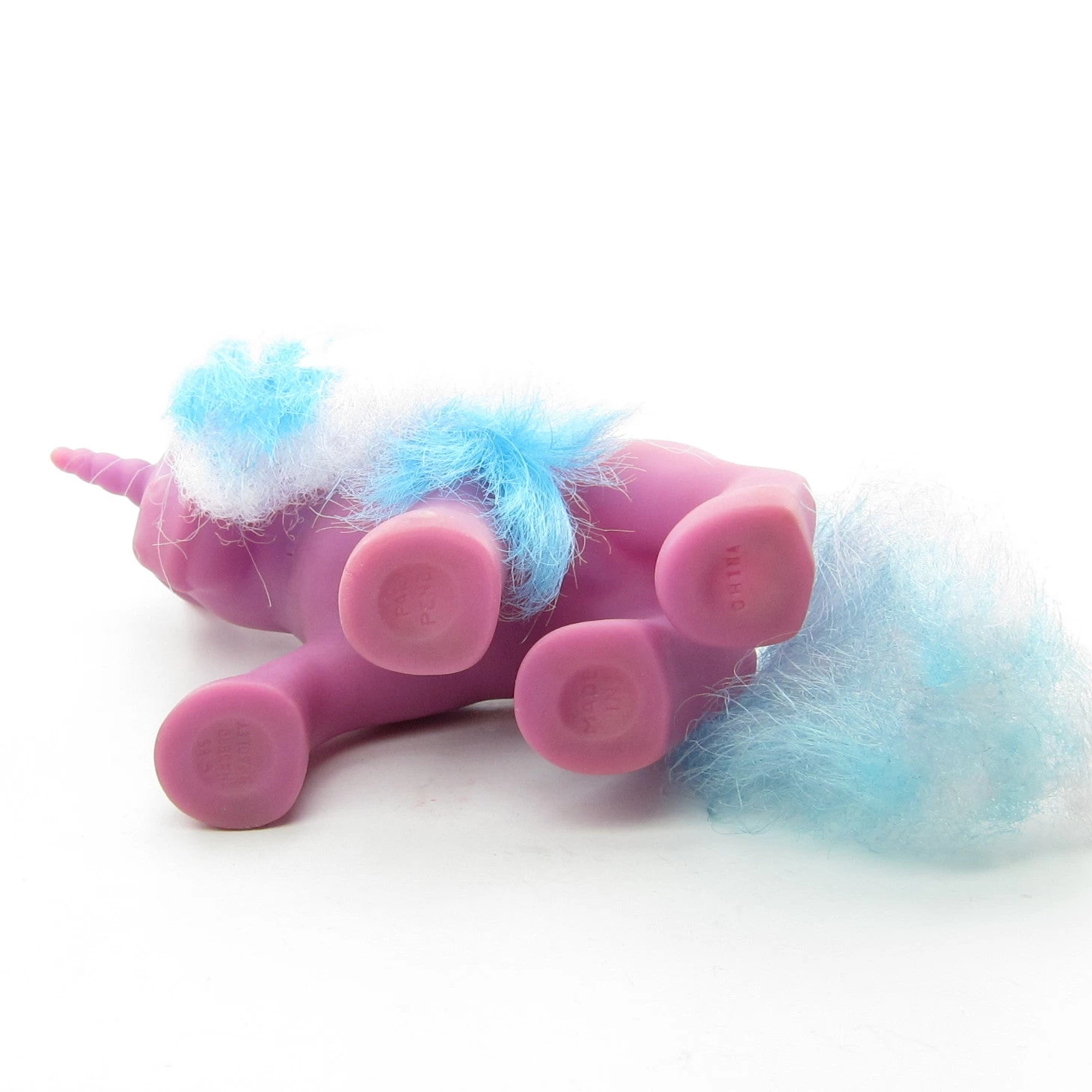 Beach Ball’s hair is very frizzy at the ends and she has a few black marks on her body. She has a bit of tail rust and a chip on her front foot, as shown in the photos. Her legs are a little warped, so she stands crooked.