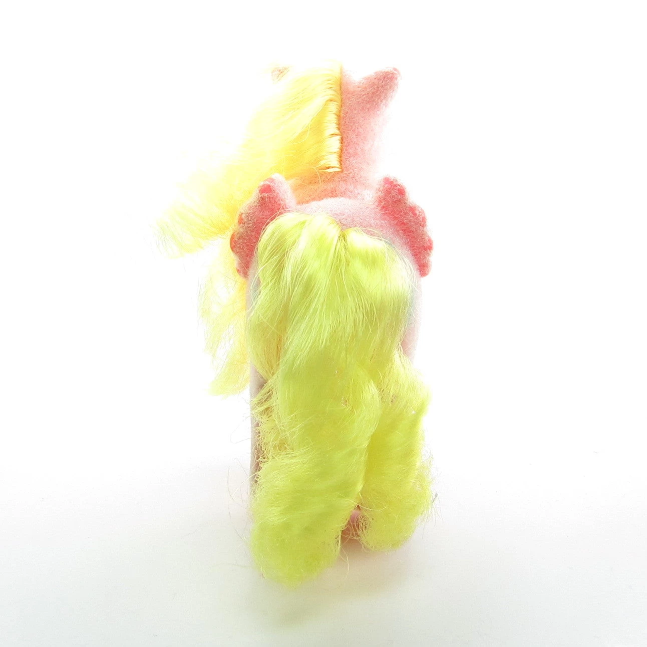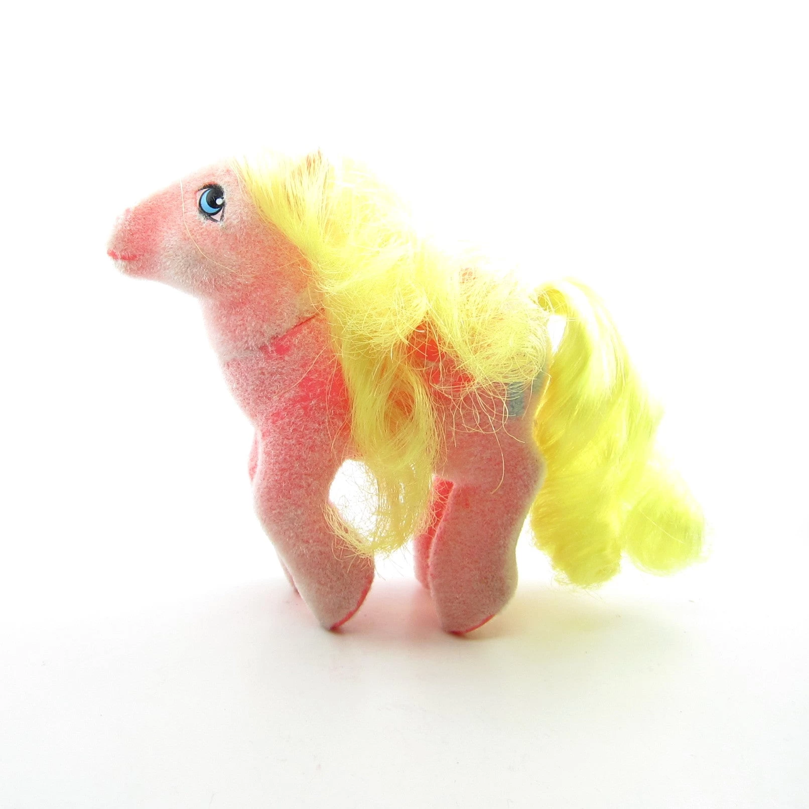 This vintage G1 My Little Pony is Best Wishes, she’s one of the So Soft Ponies from Year 4. She’s a hot pink pegasus with flocking that gives her an orange or pinkish color. She has neon yellow hair and her symbol is 3 blue birthday candles.