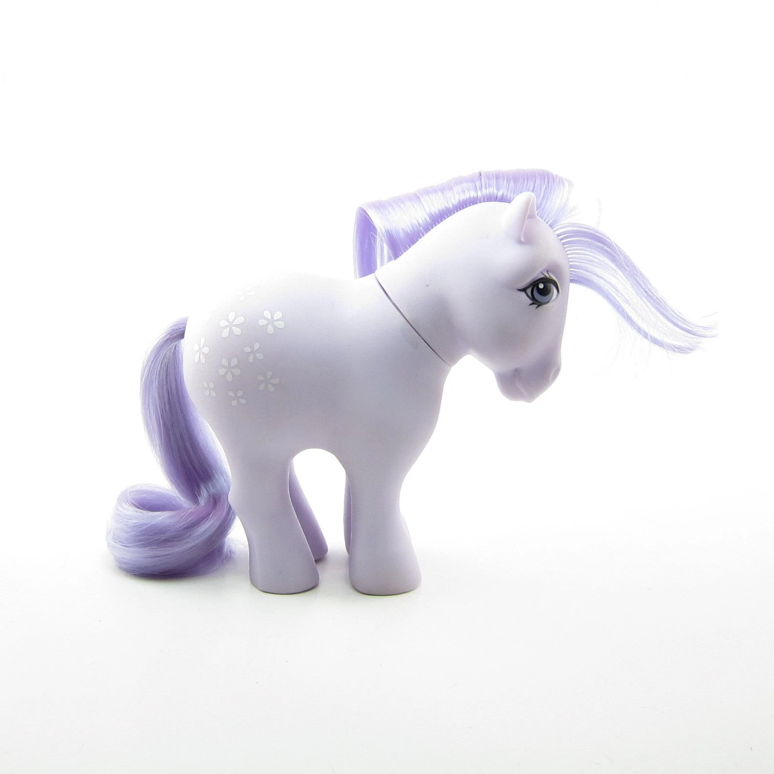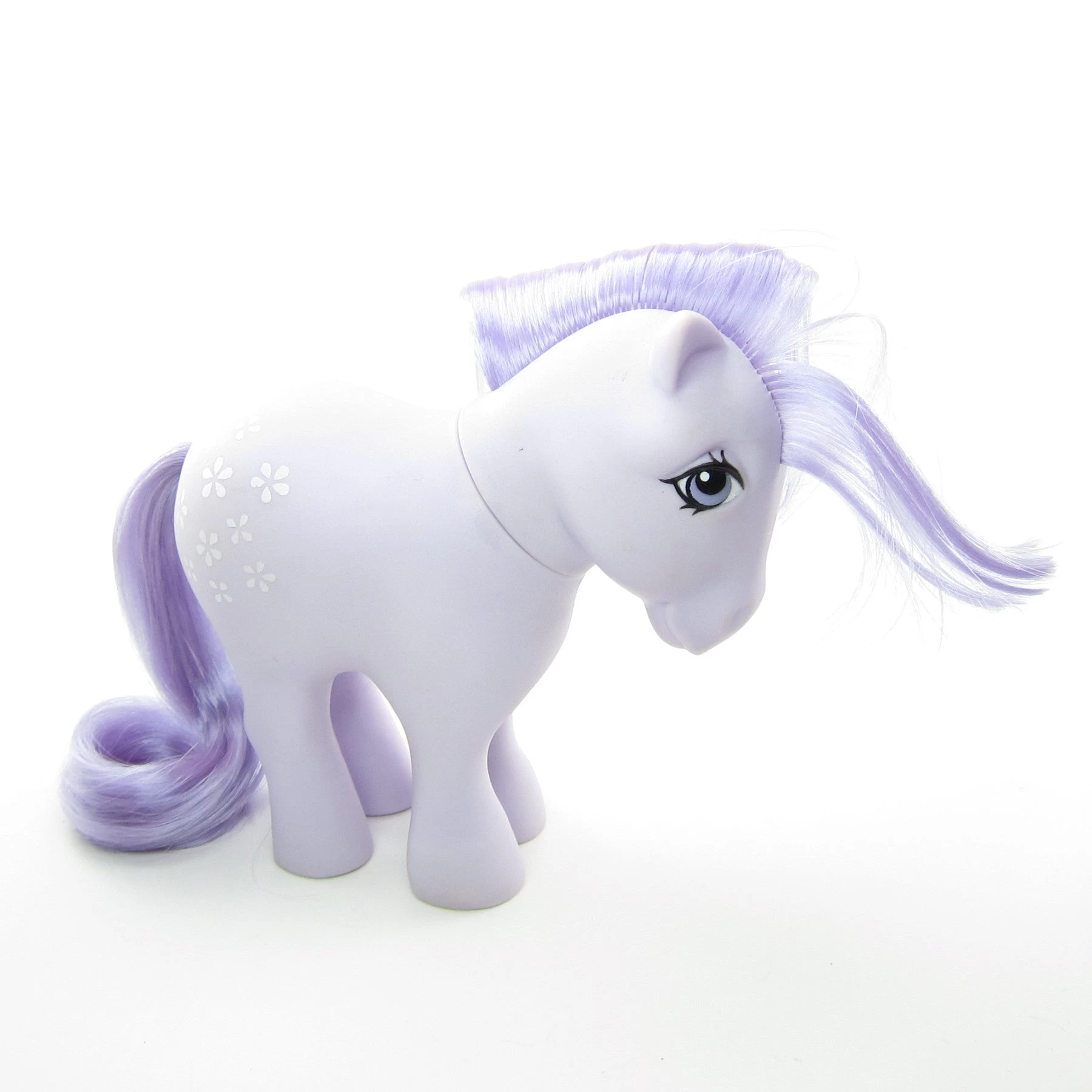 This vintage My Little Pony is Blossom, she’s lavender with white flowers as her symbol and a light purple mane and tail. She has purple eyes and is the version with concave feet.