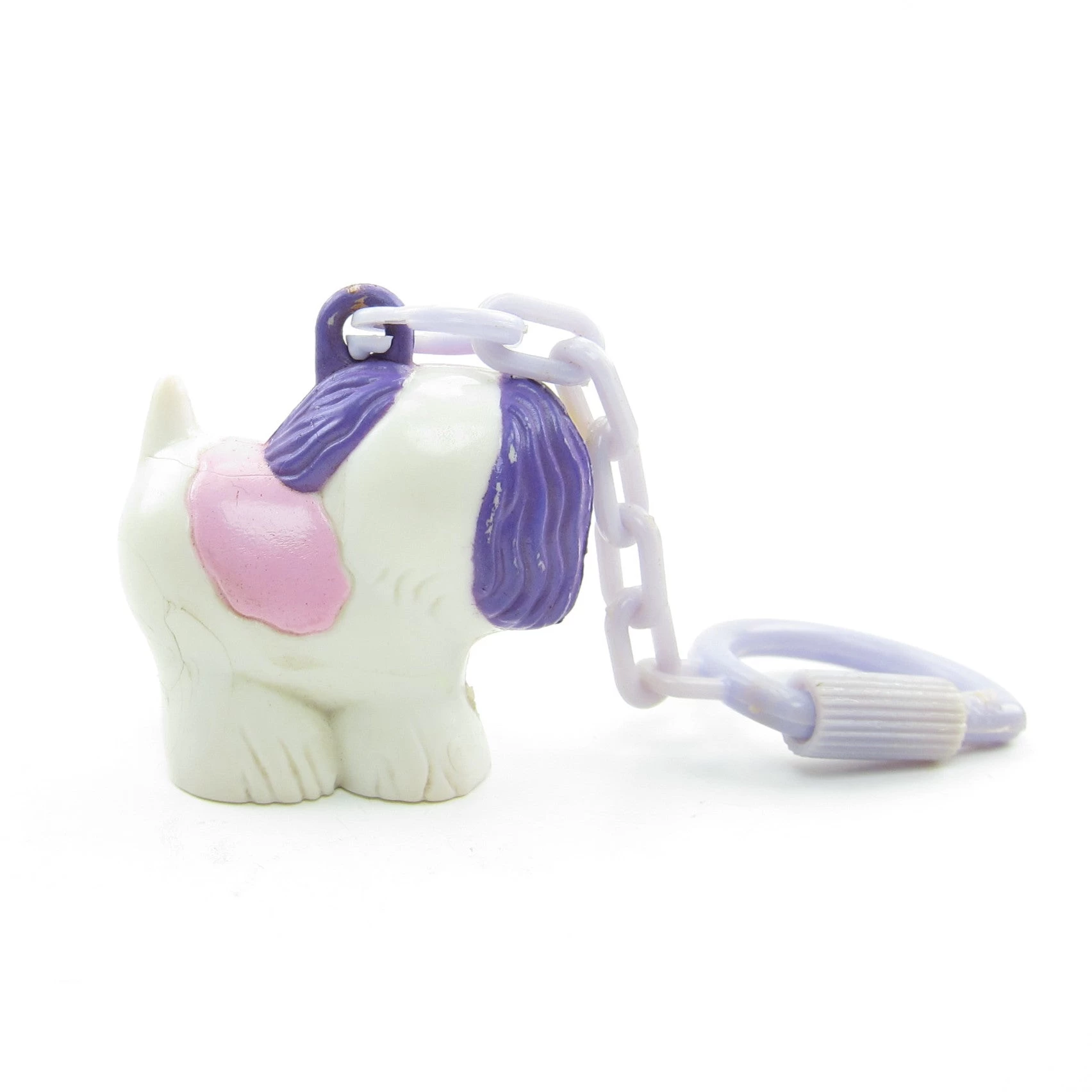 This vintage Charmkins charm is Buttercup, she’s a fluffy white dog with purple hair that hangs in her eyes. Buttercup is attached to a purple plastic keychain and has a yellow buttercup flower in her mouth and on one ear.