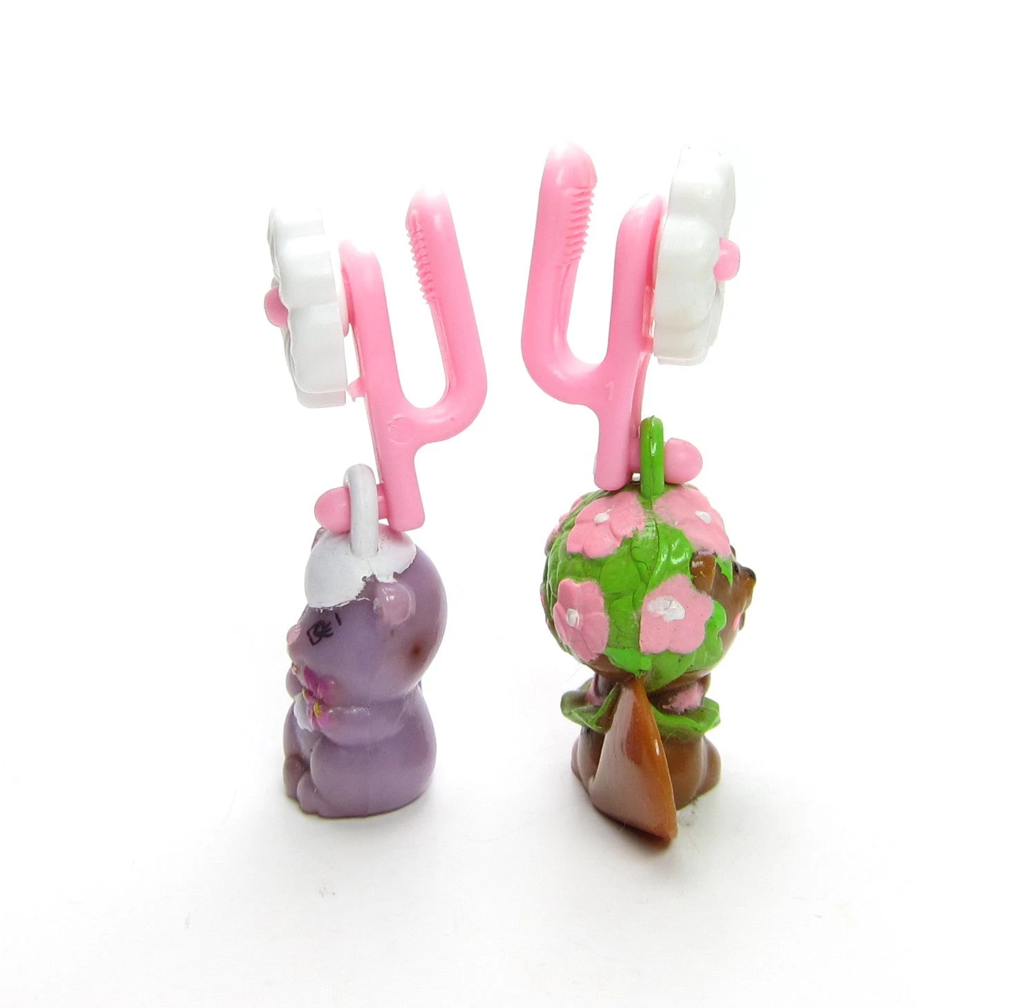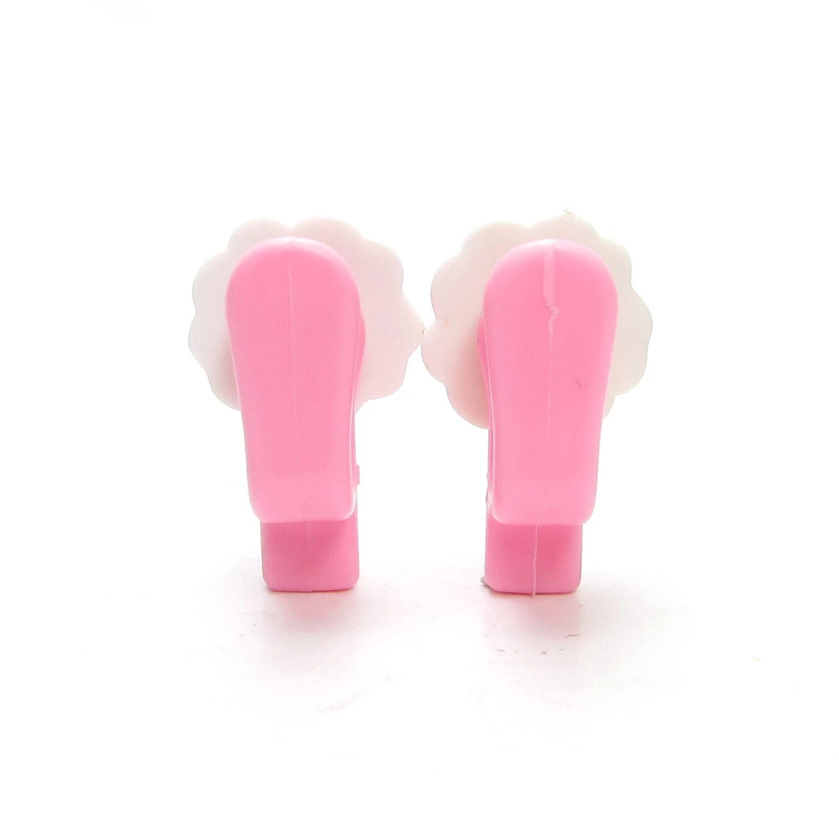 This vintage clip on earrings are the Charmkins Petal Earrings, they’re made of plastic and are pink with white flowers. Each flower has a pink center and there are pegs that hang down from the flowers so you can hang Charmkins charms from them. No Charmkins were originally included with this set, so you can add any from your own collection.
