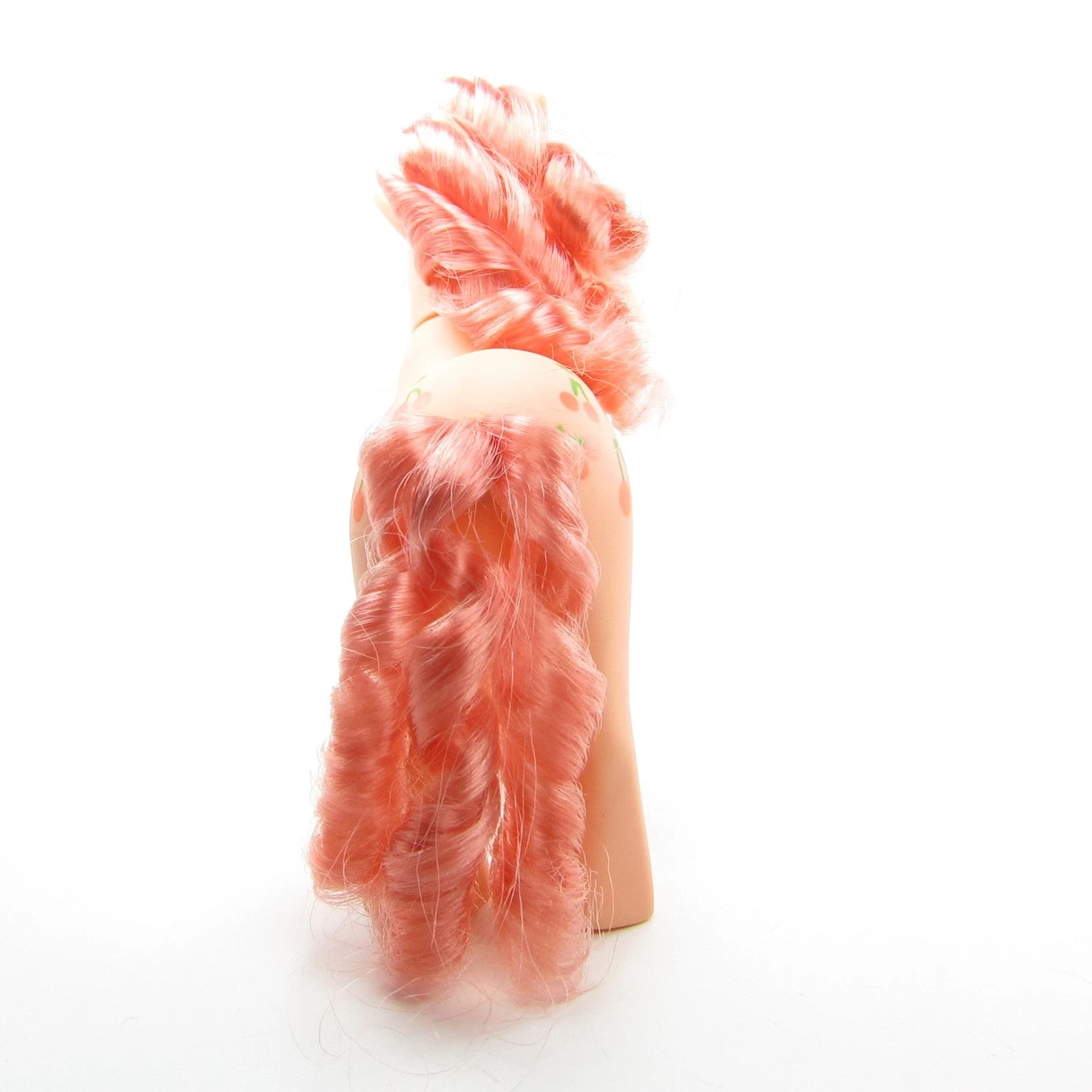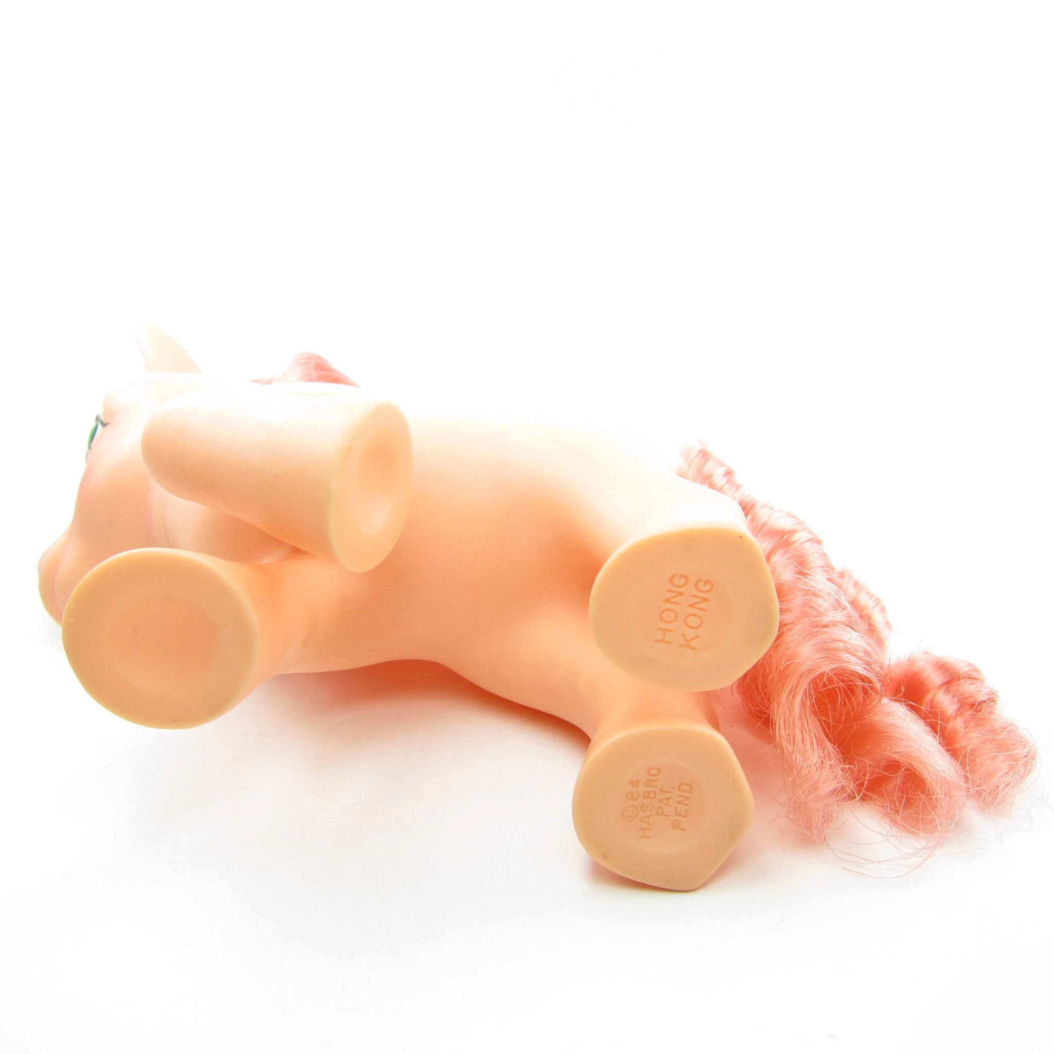 This vintage G1 My Little Pony is Cherries Jubilee, she’s a pink pony that was released in Year 3 of the My Little Pony line. Her hair is a lovely pink or light red color and she has green eyes. Her symbol is five cherries with green stems.