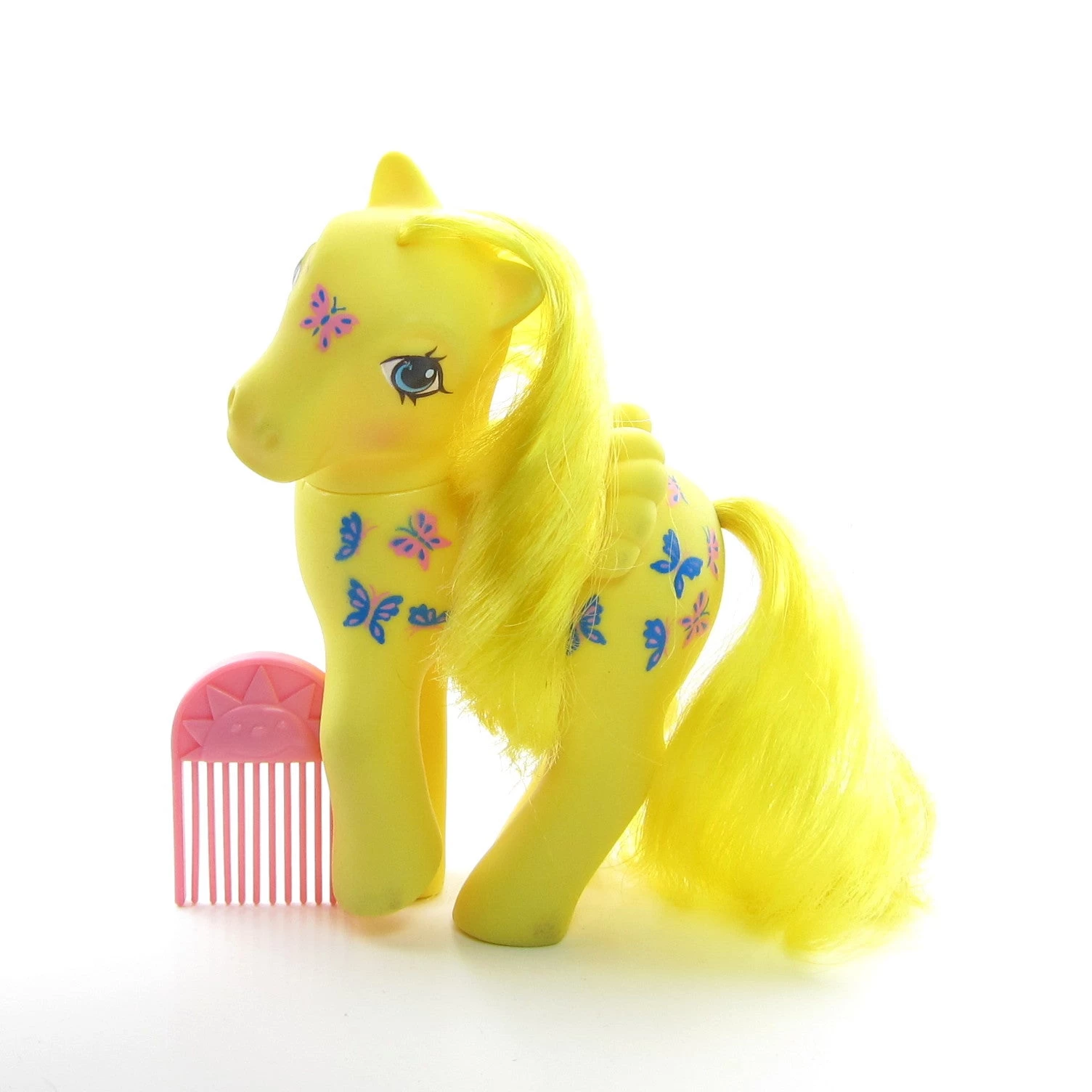 This vintage G1 My Little Pony is Dancing Butterflies, she’s a yellow pegasus with yellow hair and blue eyes. Her symbol is pink and blue butterflies.