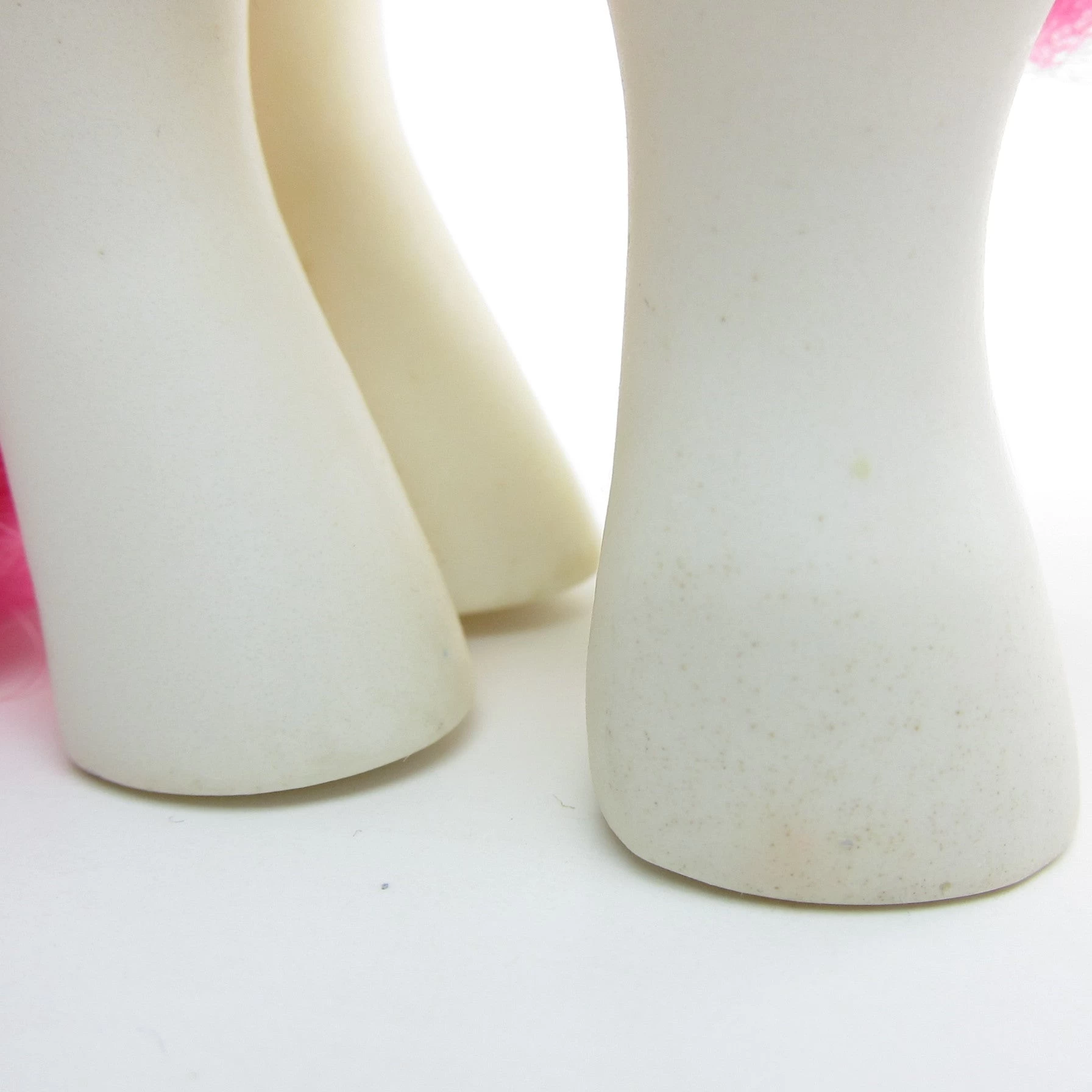 Violet’s hair is smooth and free of tangles. Her body has yellowed a little with age and shows some dirt and scuffs, which is common for white ponies. She has some tiny brown dots on her legs and feet and some marker writing on the bottom of one foot, as shown in the photos.