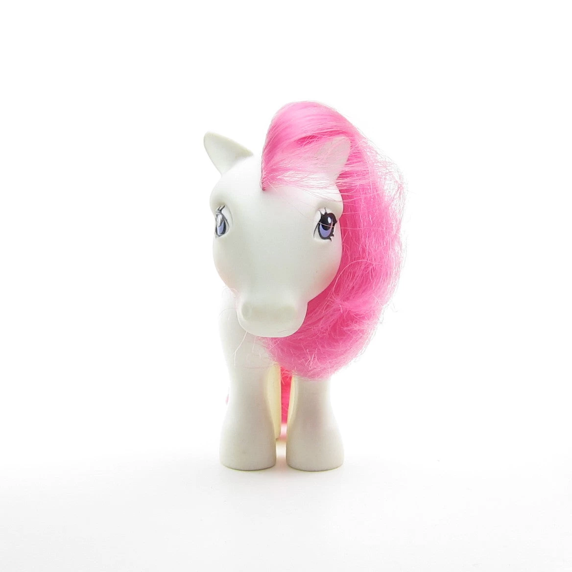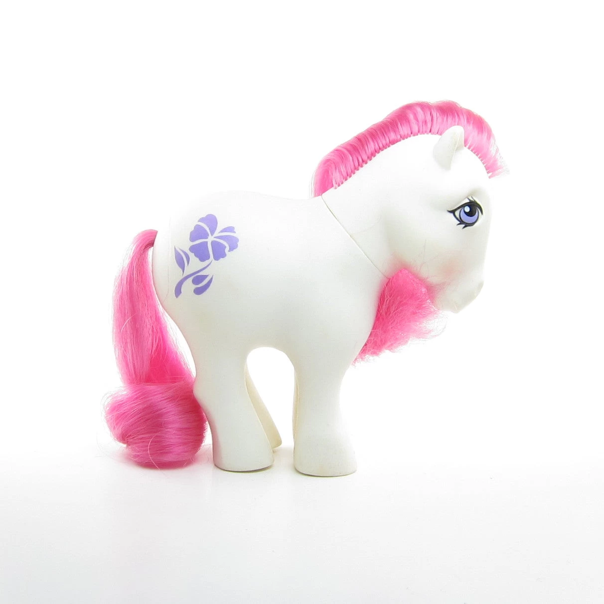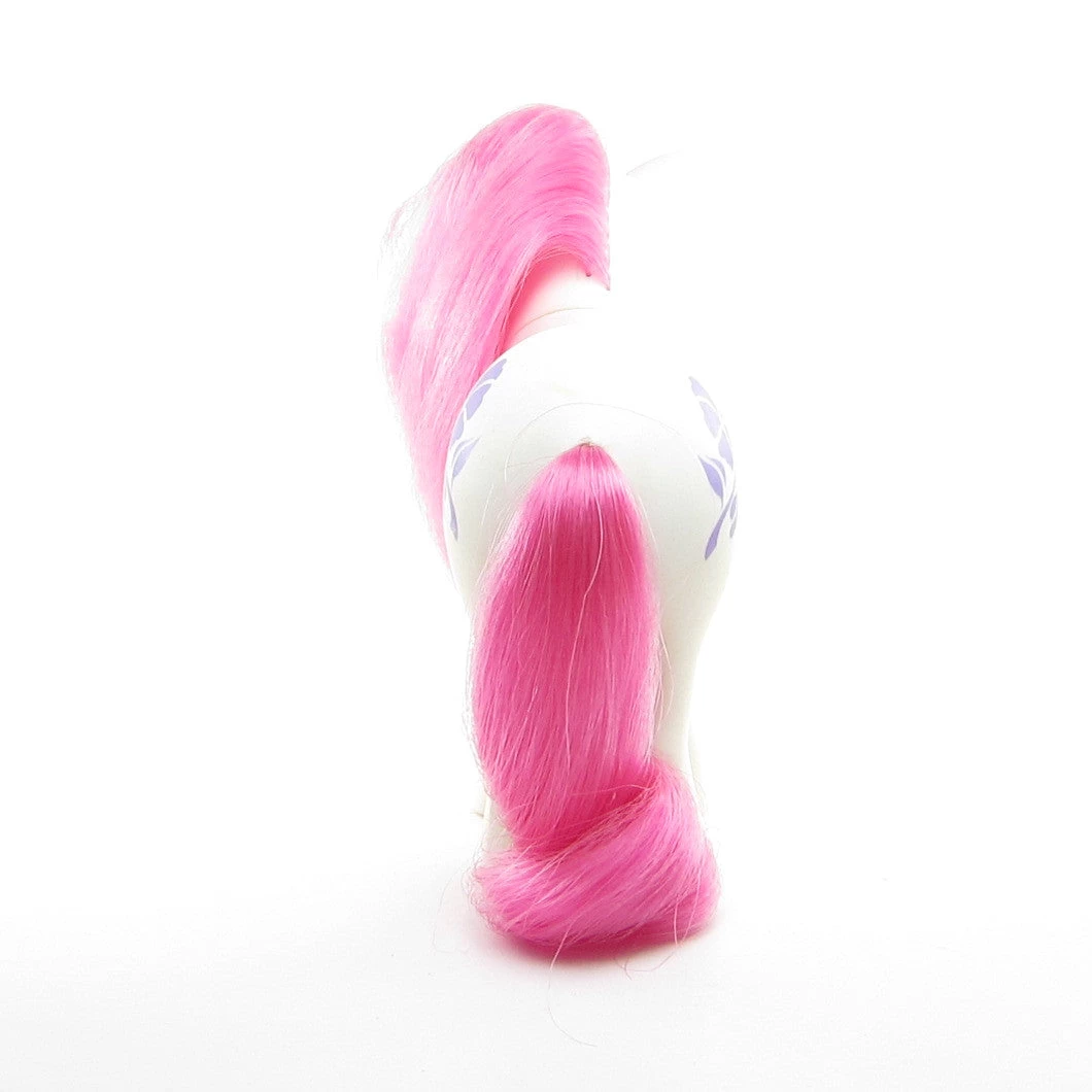 This vintage My Little Pony is Violet, she’s the Birthflower Pony for the month of February. She’s a white Earth pony with a bright pink mane and tail and purple eyes. Her symbol is a purple violet, February’s birth flower.