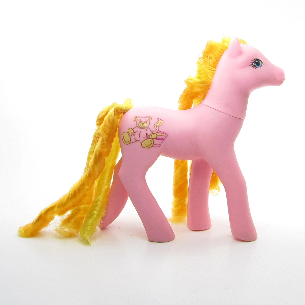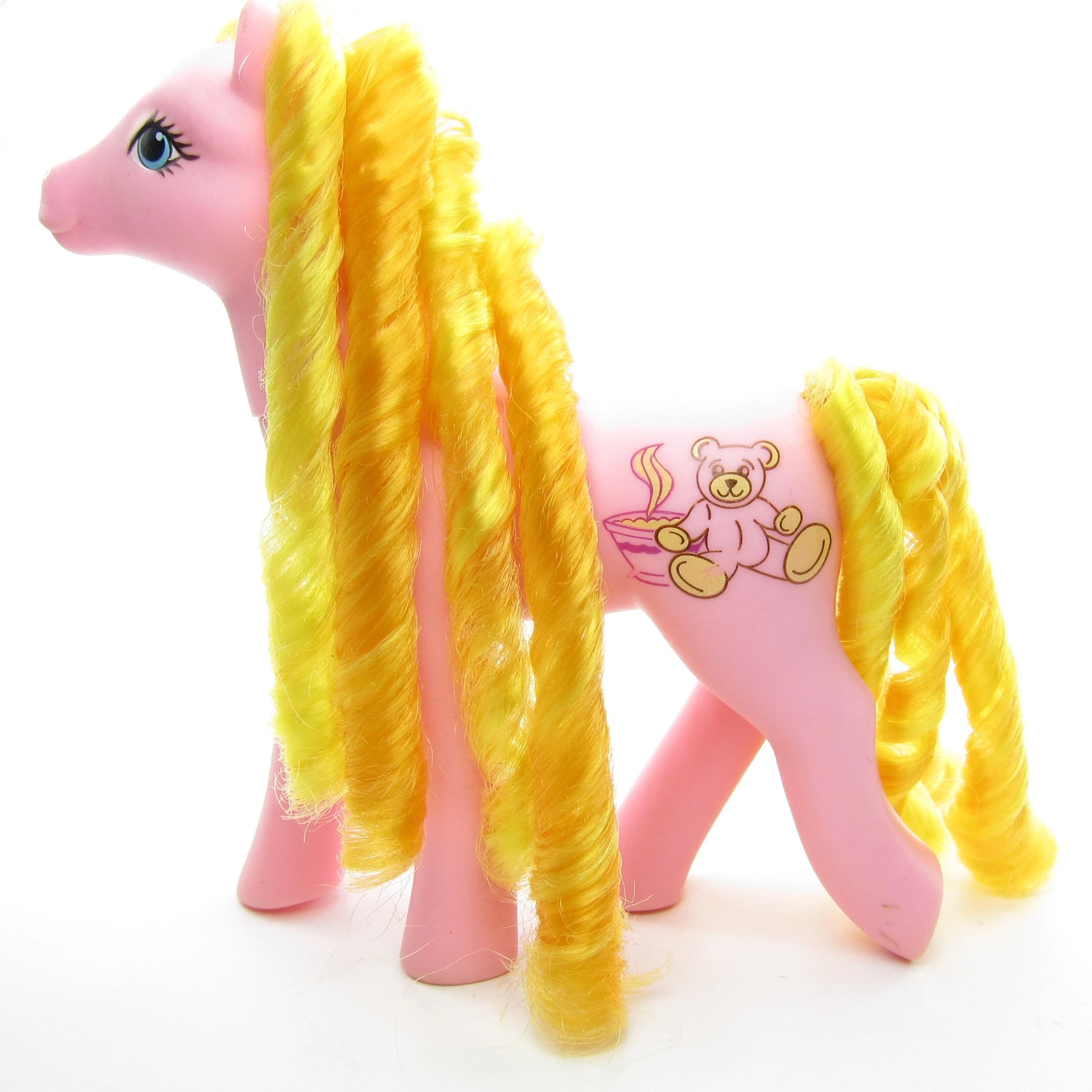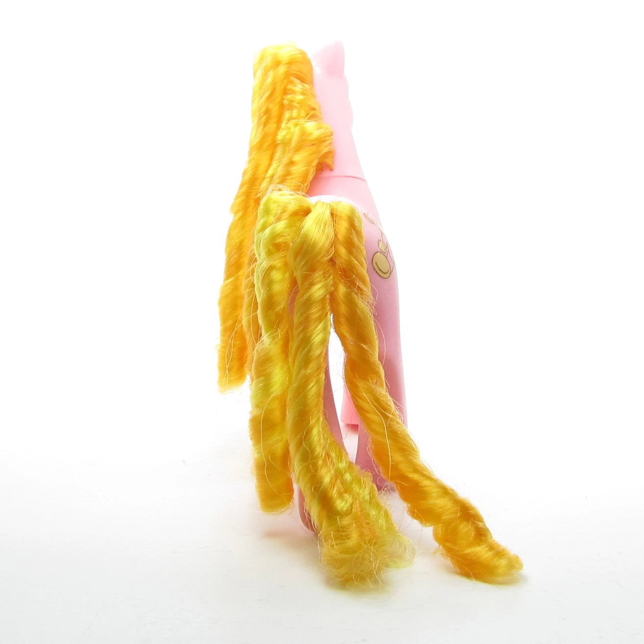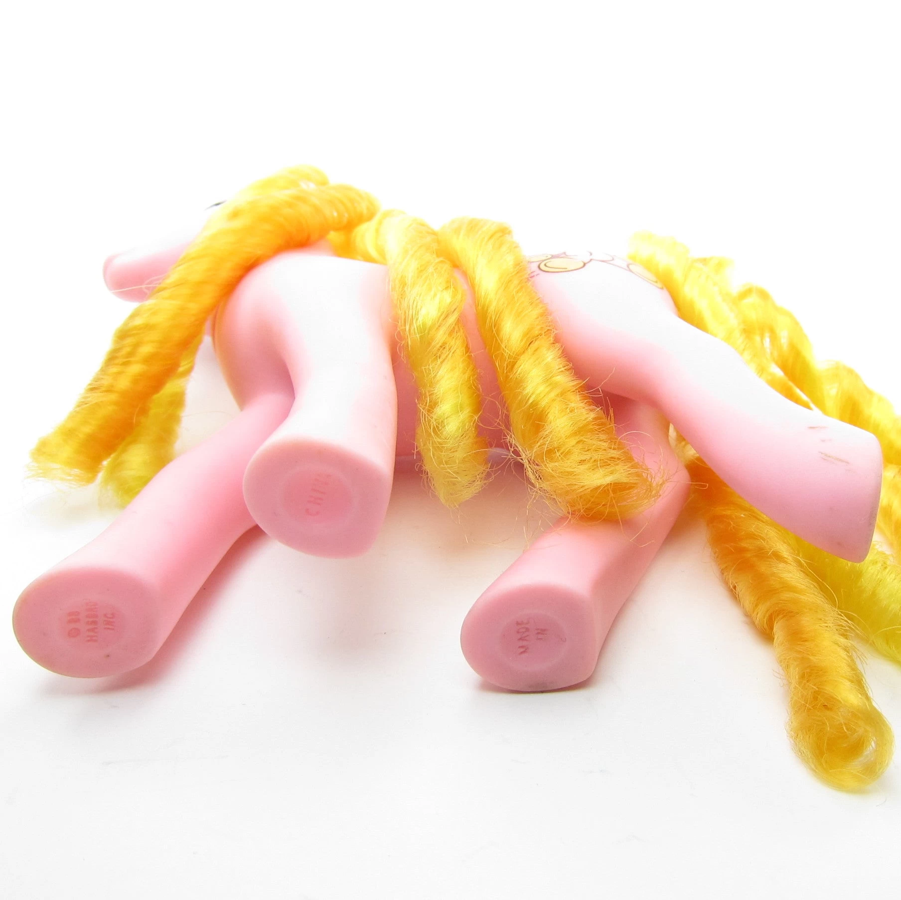 This vintage G1 My Little Pony is Goldilocks, she’s a Sweetheart Sister pony from Year 8. Goldilocks was never sold in stores and was available only through a mail order offer by sending in proof of purchase Horseshoe Points.
