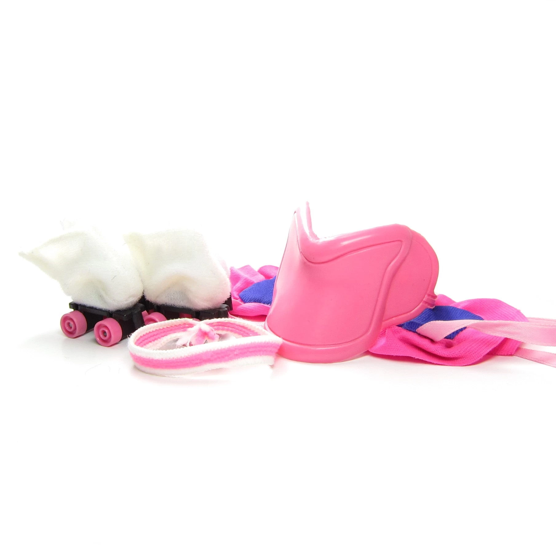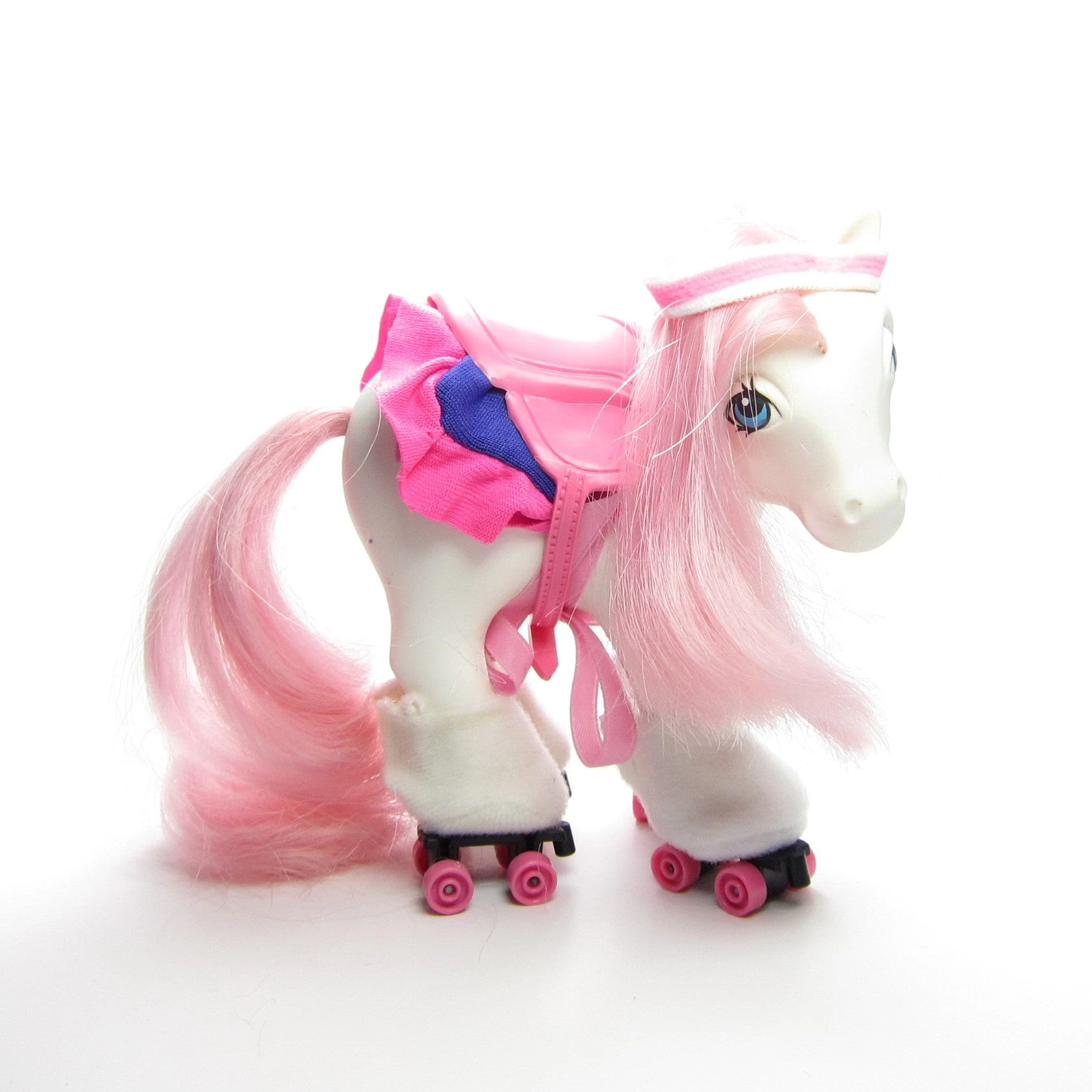 This vintage G1 My Little Pony outfit is the Great Skates Pony Wear set. It includes white roller skates with pink wheels, a ruffly pink and purple blanket, a pink plastic saddle, and a pink and white elastic headband.