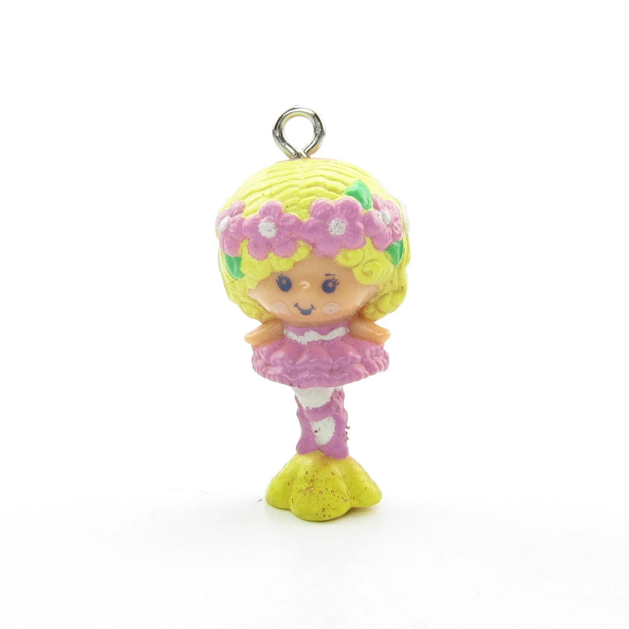 The original loop on top of Lady Slipper’s head has been replaced by a metal finding instead. So she could be added to a piece of jewelry, but may not fit on the Charmkins jewelry hangers. She also has some paint rubs, as shown in the photos.