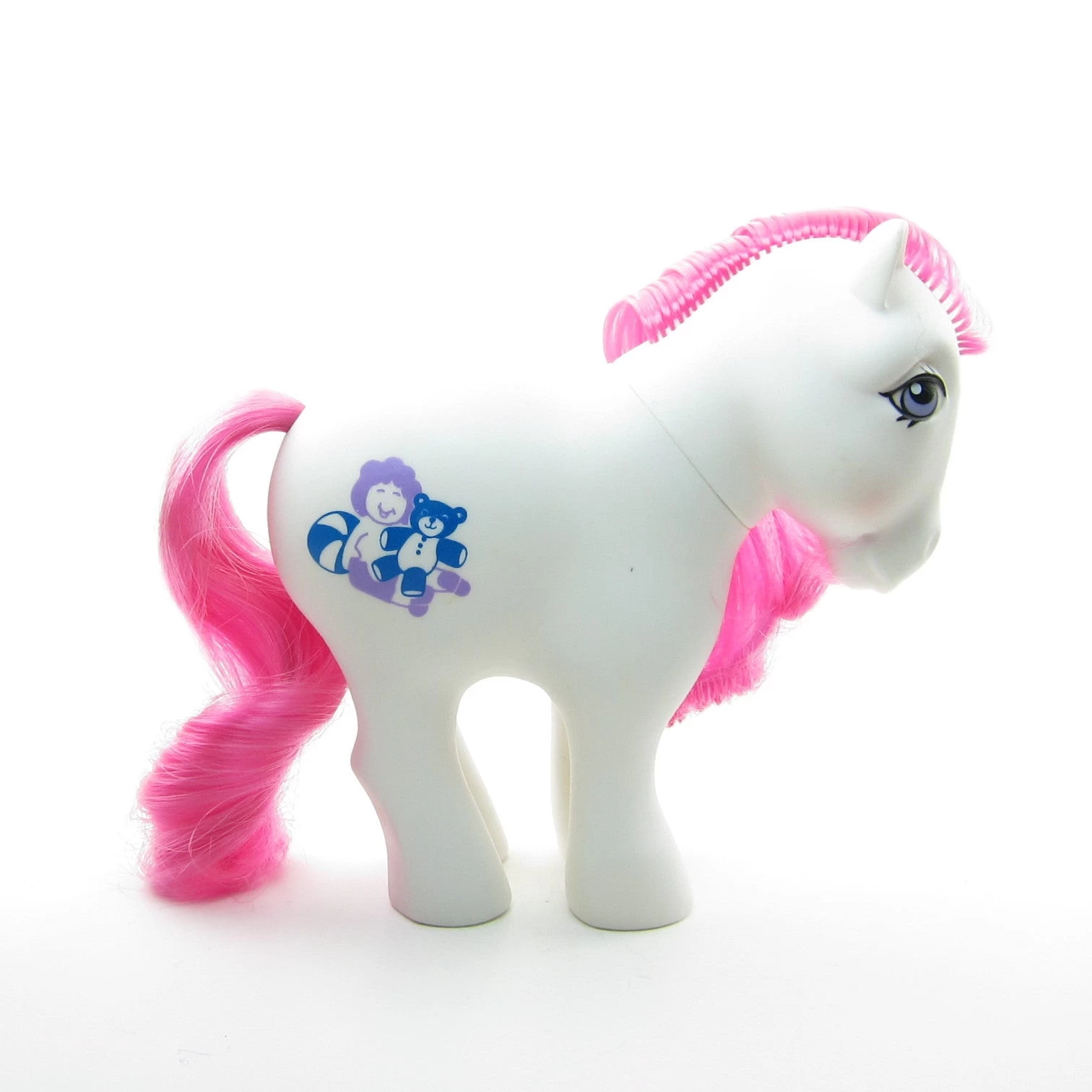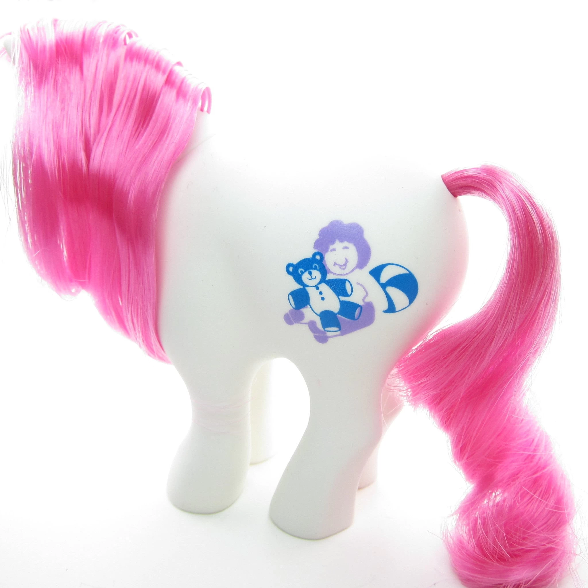 This vintage My Little Pony is Li’l Tot. She’s a white Earth pony with a bright pink mane and tail and purple eyes, similar to the style of the Birthflower Ponies. Her symbol is a purple doll or child with a blue teddy bear and ball.