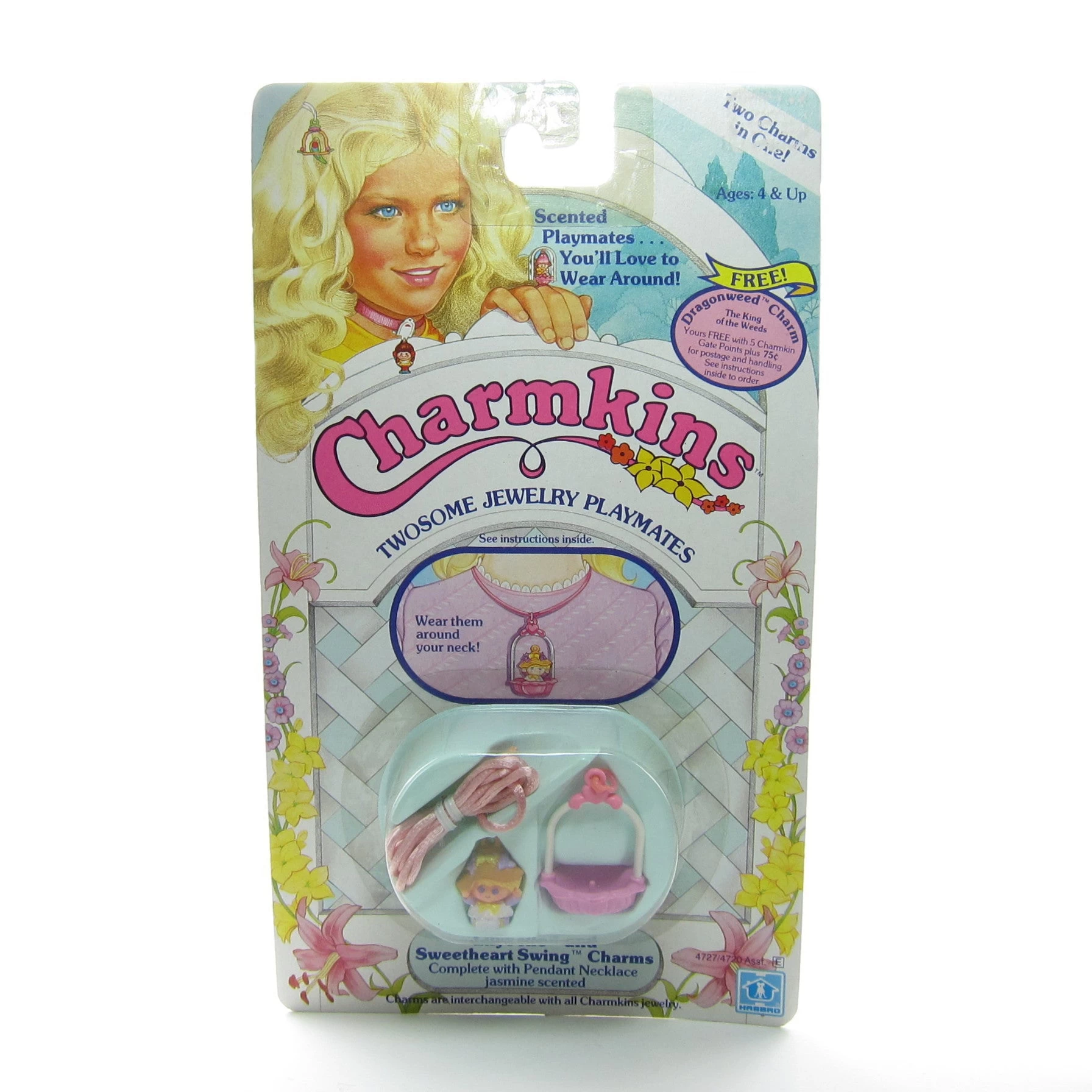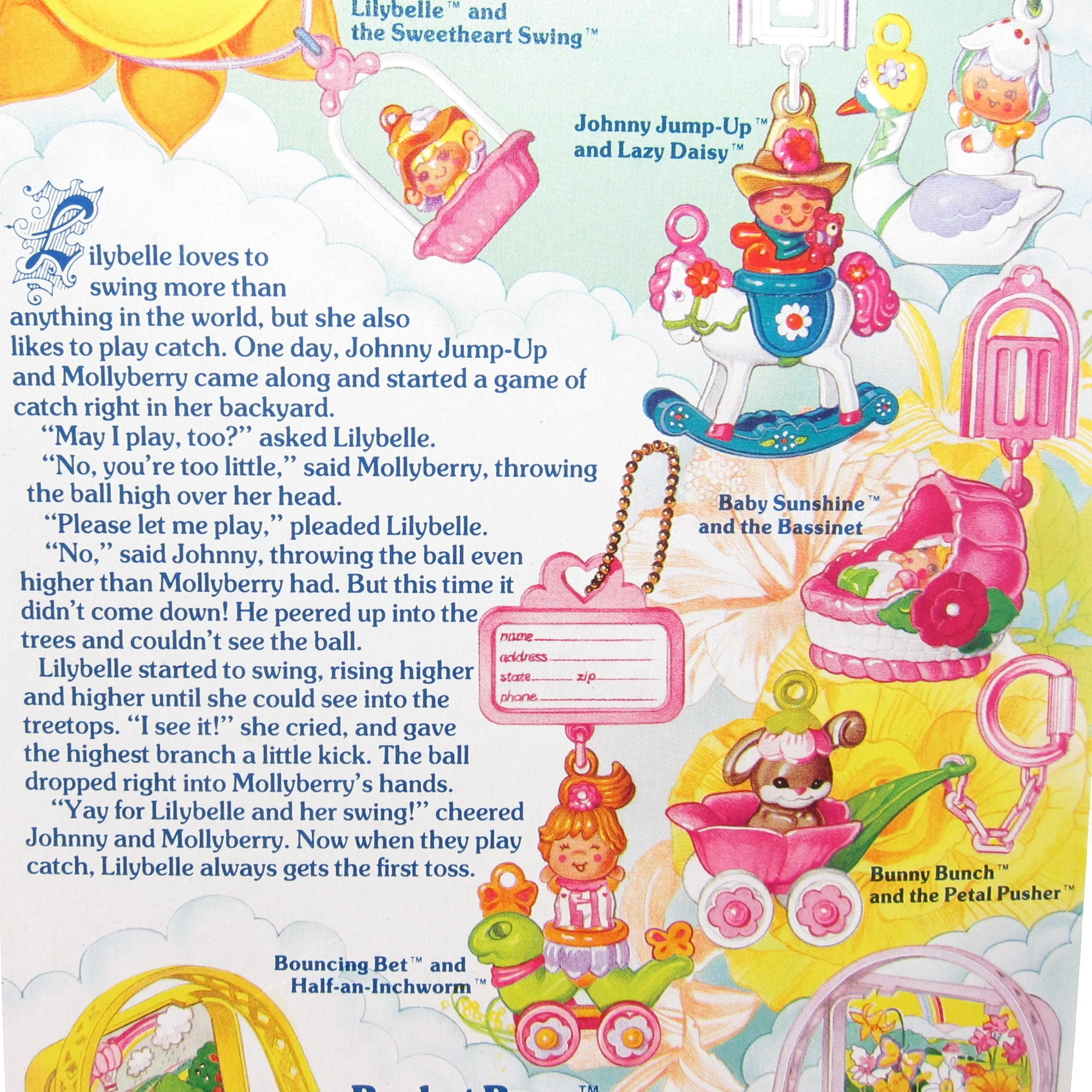 This vintage Charmkins charm is Lilybelle and Sweetheart Swing, it’s still factory sealed in the plastic blister pack on the original backcard. Lilybelle has short blonde hair and wears a brown straw hat with purple flowers and a yellow bow. Her dress is purple and white and her swing looks like a purple flower.