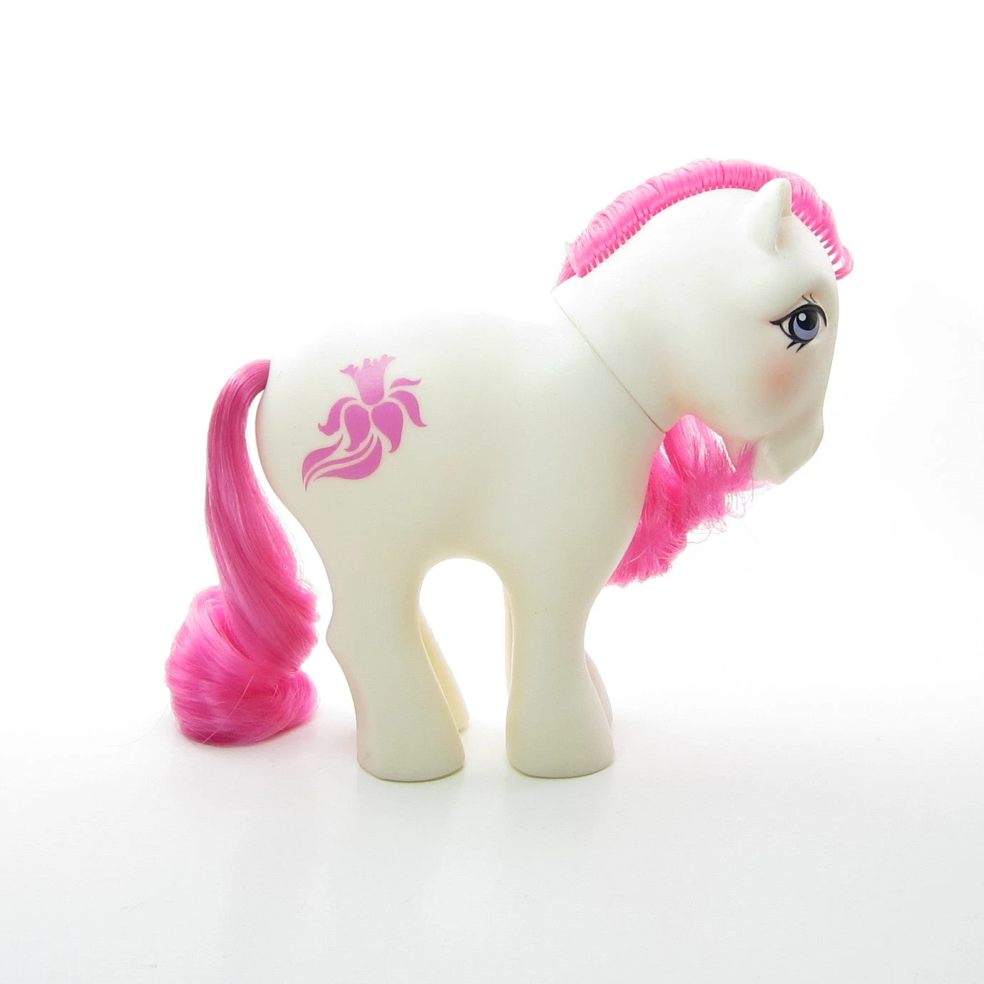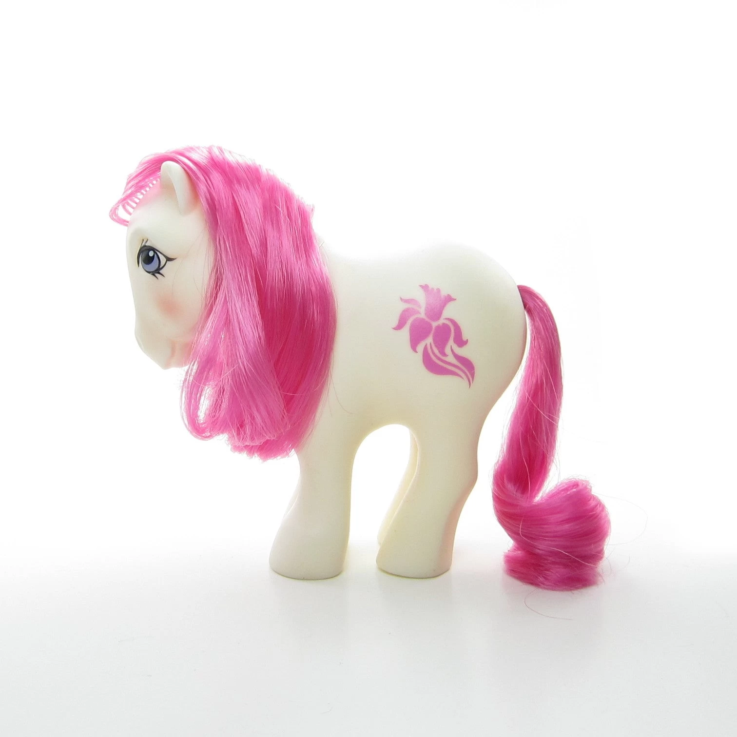 This vintage My Little Pony is Daffodil, she’s the Birthflower Pony for the month of March. She’s a white Earth pony with a bright pink mane and tail and purple eyes. Her symbol is a pink daffodil, March’s birth flower.