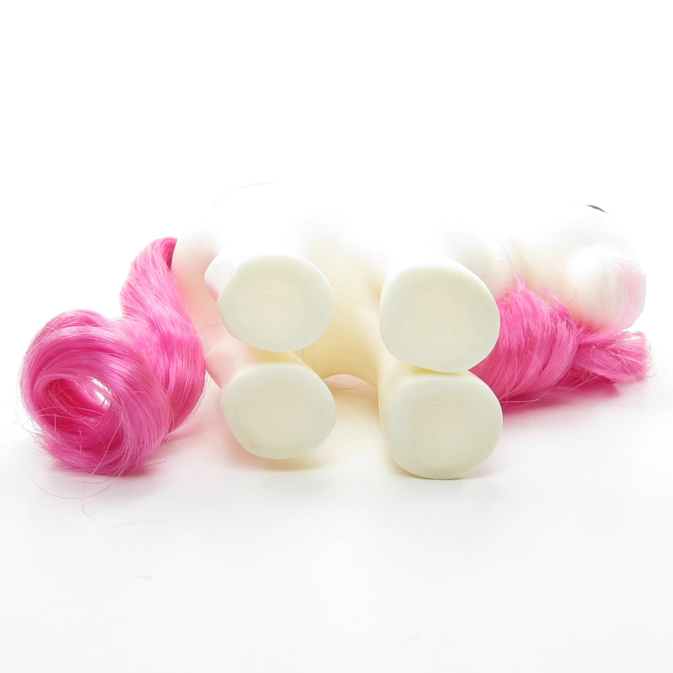 Daffodil’s hair is smooth and free of tangles. Her body has yellowed a little with age and shows some dirt, which is common for white ponies. She has a scuff in the cheek blush on her non-display side. She’s otherwise in good vintage condition.