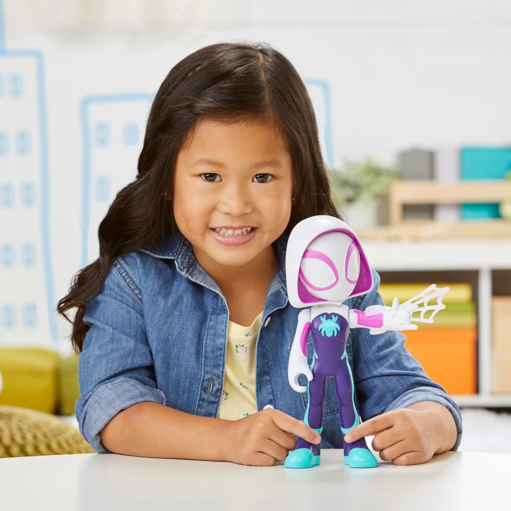 It’s Spidey time! Spidey and His Amazing Friends Supersized Ghost-Spider action figure is made for big imaginations. At 9 inches tall, this large-scale, poseable superhero action figure is big, friendly, and ready to play! Kids can can attach the included web accessory to the figure’s wrist and move Ghost-Spider figure’s head and arms into fun action poses to recreate favorite scenes from the preschool Marvel animated show on Disney Junior. Look for Supersized Spidey and Supersized Miles Morales: Spider-Man action figures (each sold separately, subject to availability) for more Spidey fun! These Spidey toys make great gifts for kids ages 3 and up who love the Super Hero adventures of the Spidey Team. Copyright MARVEL. All trademarks and registered trademarks are the property of their respective owners. Hasbro and all related terms are trademarks of Hasbro.
