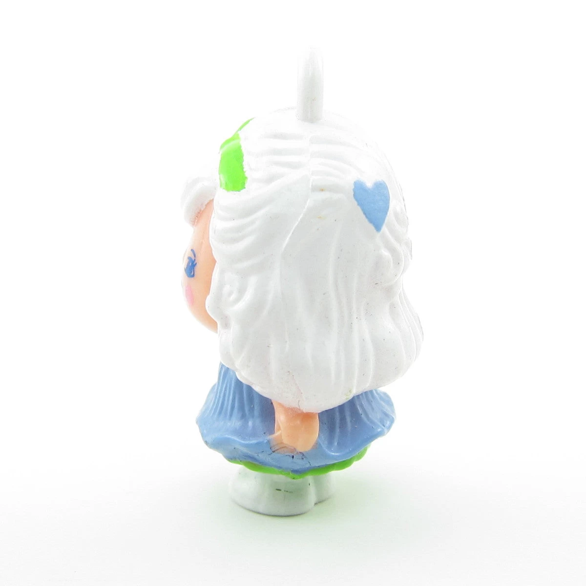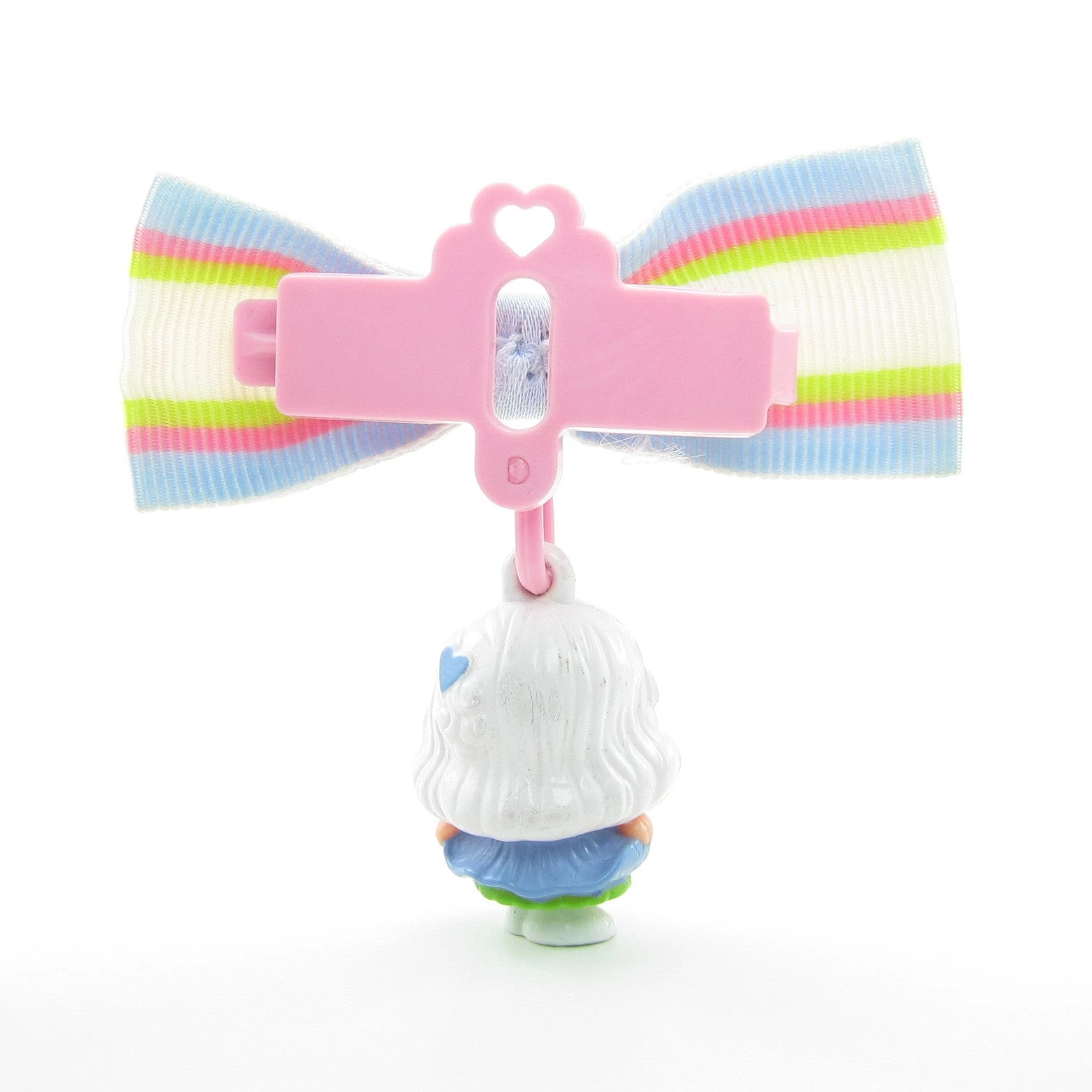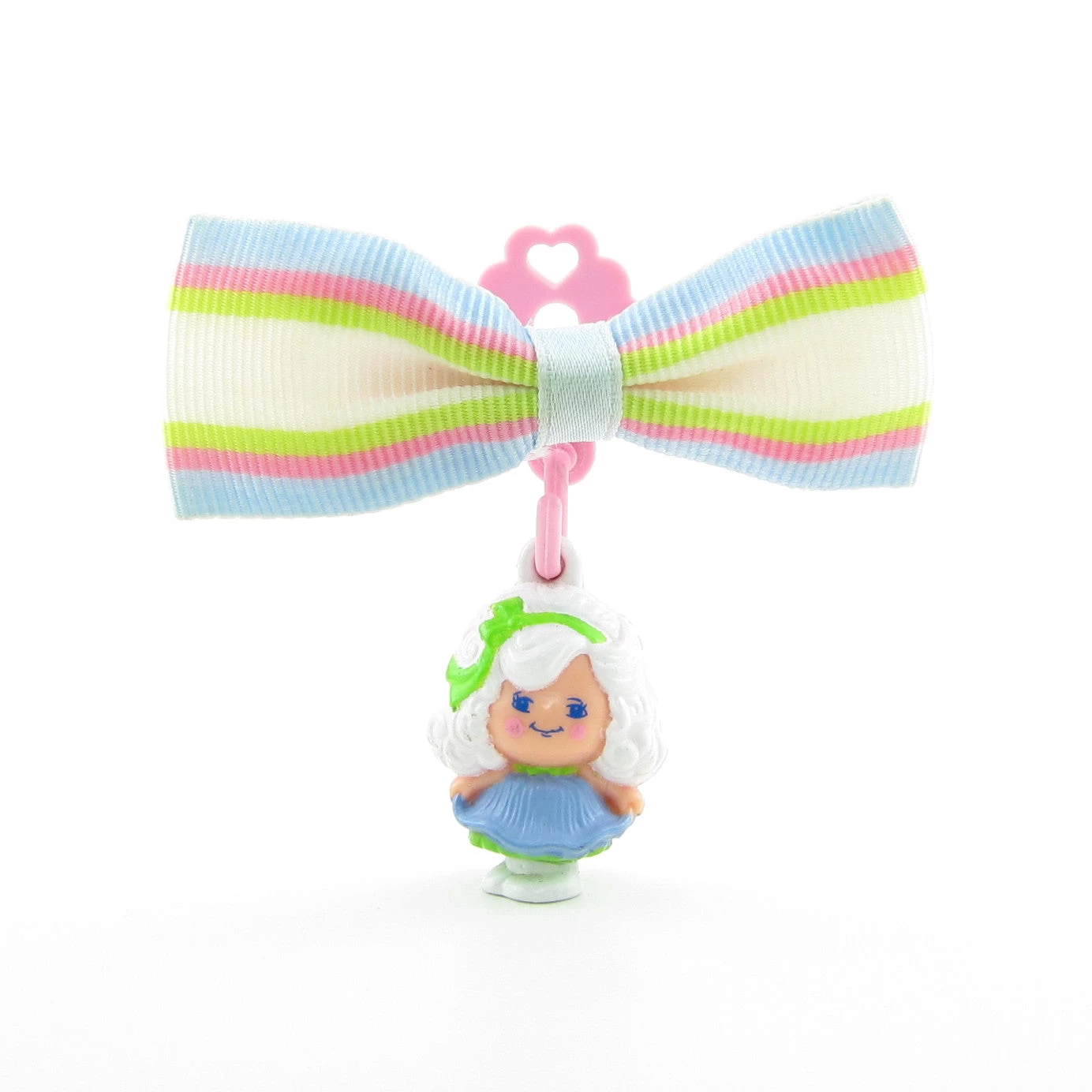 This vintage Charmkins charm is Morning Glory, she hangs from a fabric bow tie barrette. Morning Glory wears a blue and green dress and has white hair with a green bow in it.