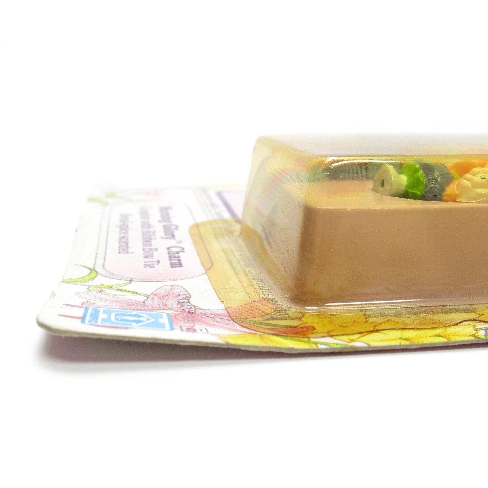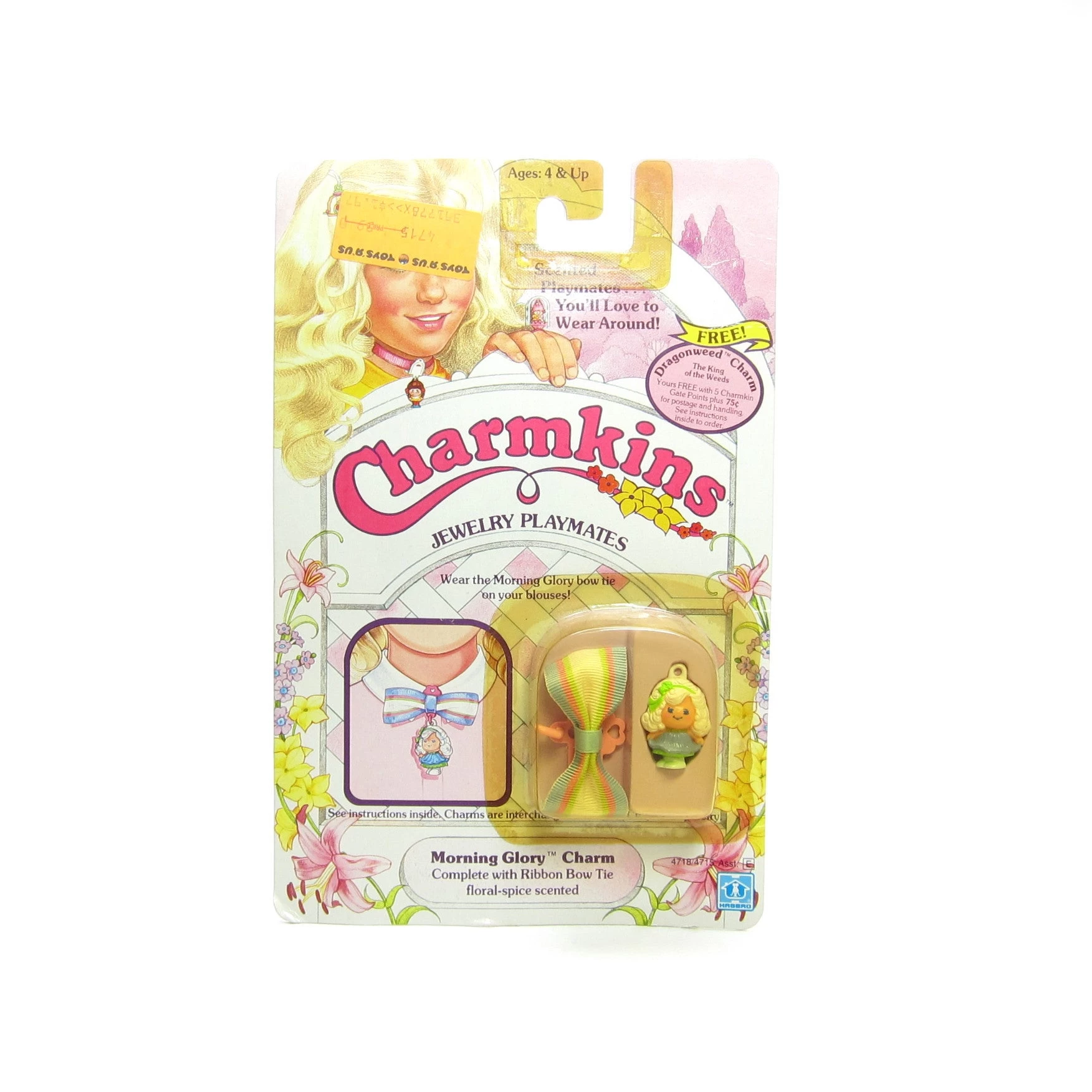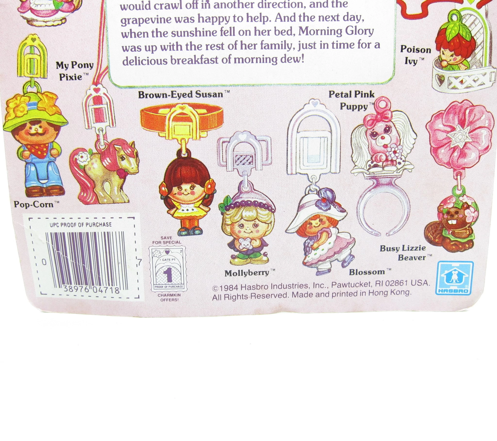 This vintage Charmkins charm is Morning Glory, she’s still factory sealed in the plastic blister pack on the original backcard. Morning Glory wears a blue and green petal-shaped dress and has white hair with a green bow in it. She hangs from a pink barrette with a fabric bow. The fabric has stripes of blue, pink, green, and white.