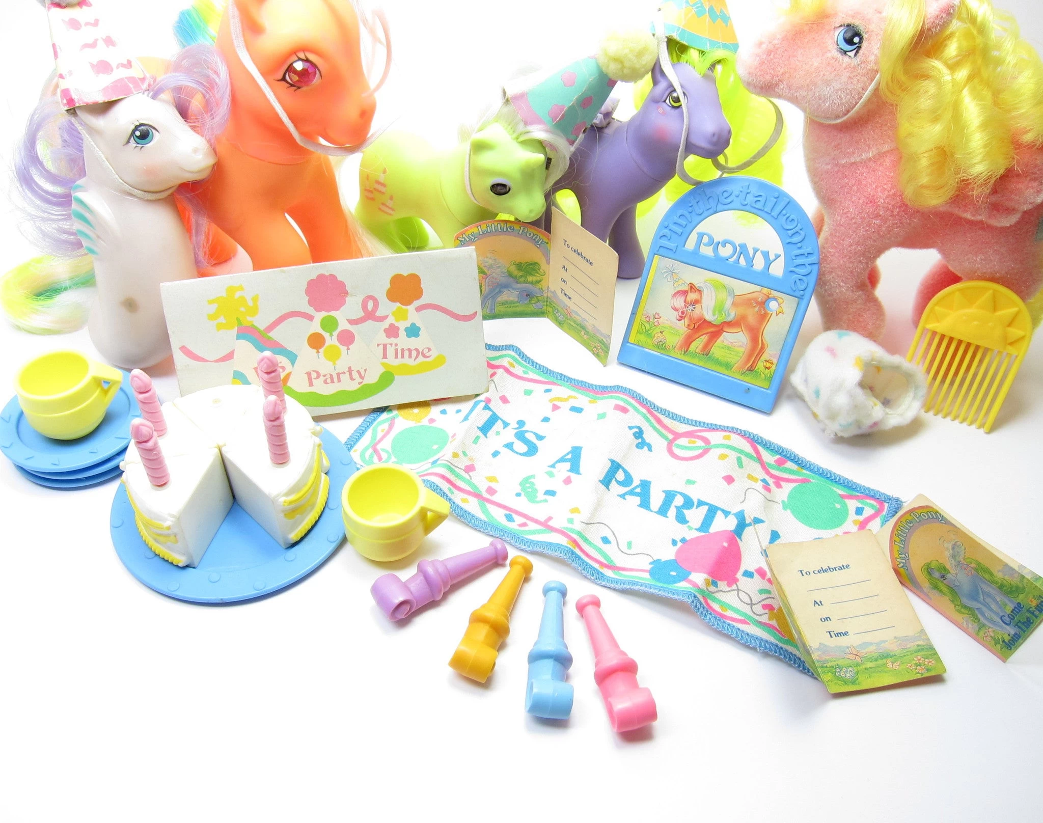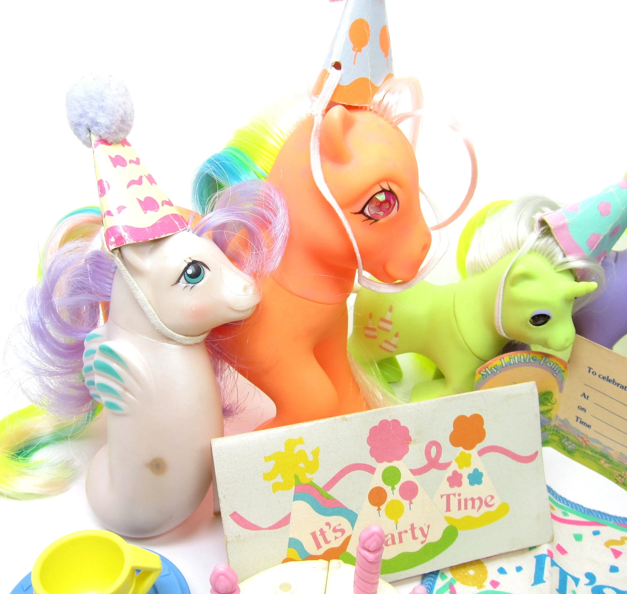 This vintage G1 My Little Pony set is the Party Gift Pack from Year 4. It’s a fun collection of party accessories and also includes ponies in five of the different styles new to the Year 4 line – a Pretty ‘N Pearly Baby Sea Pony, a Twinkle-Eyed Pony, a Baby Pony with Beddy-Bye Eyes, a Flutter Pony, and a So Soft Pony. Each pony has a party-themed symbol, and there are lots of fun accessories to help celebrate!