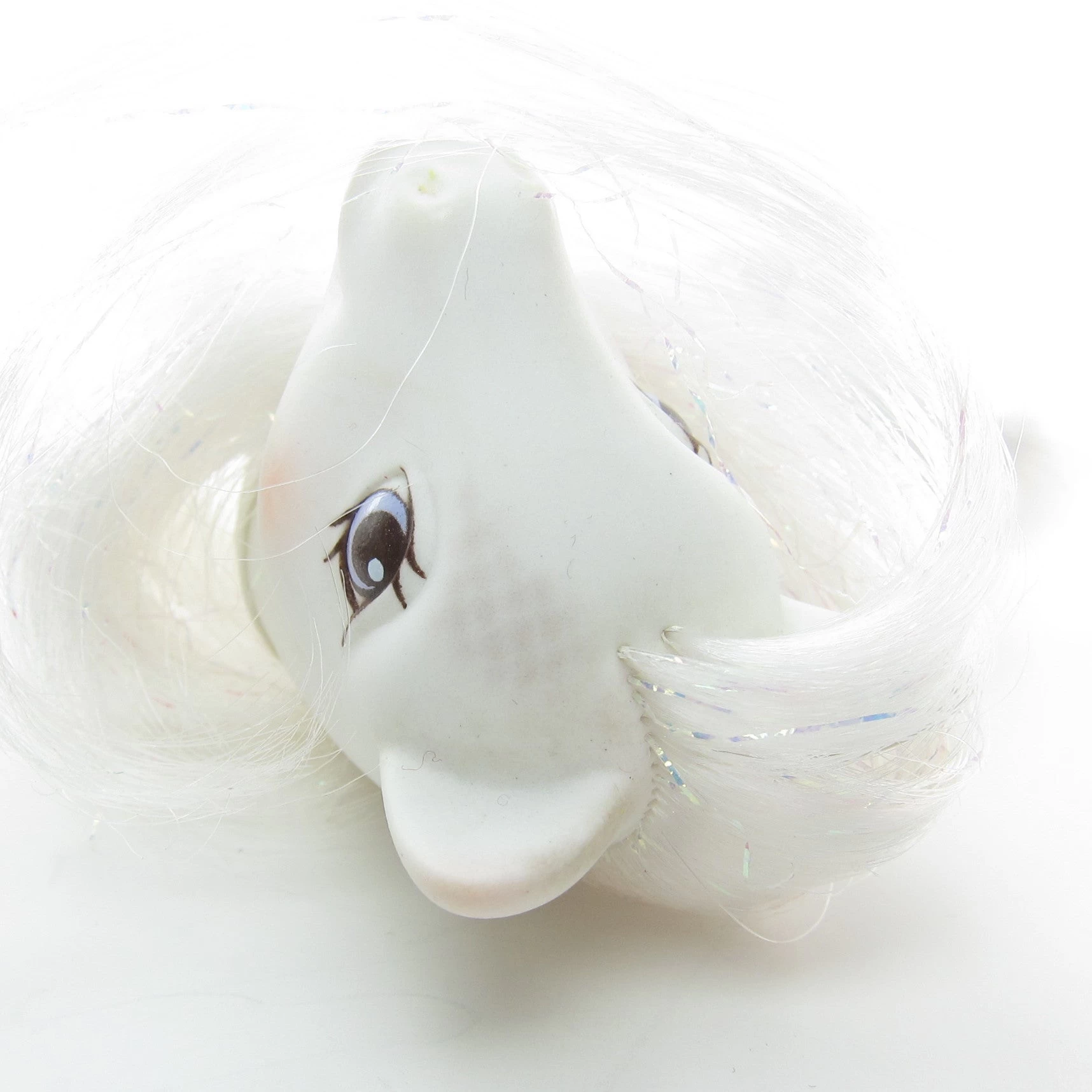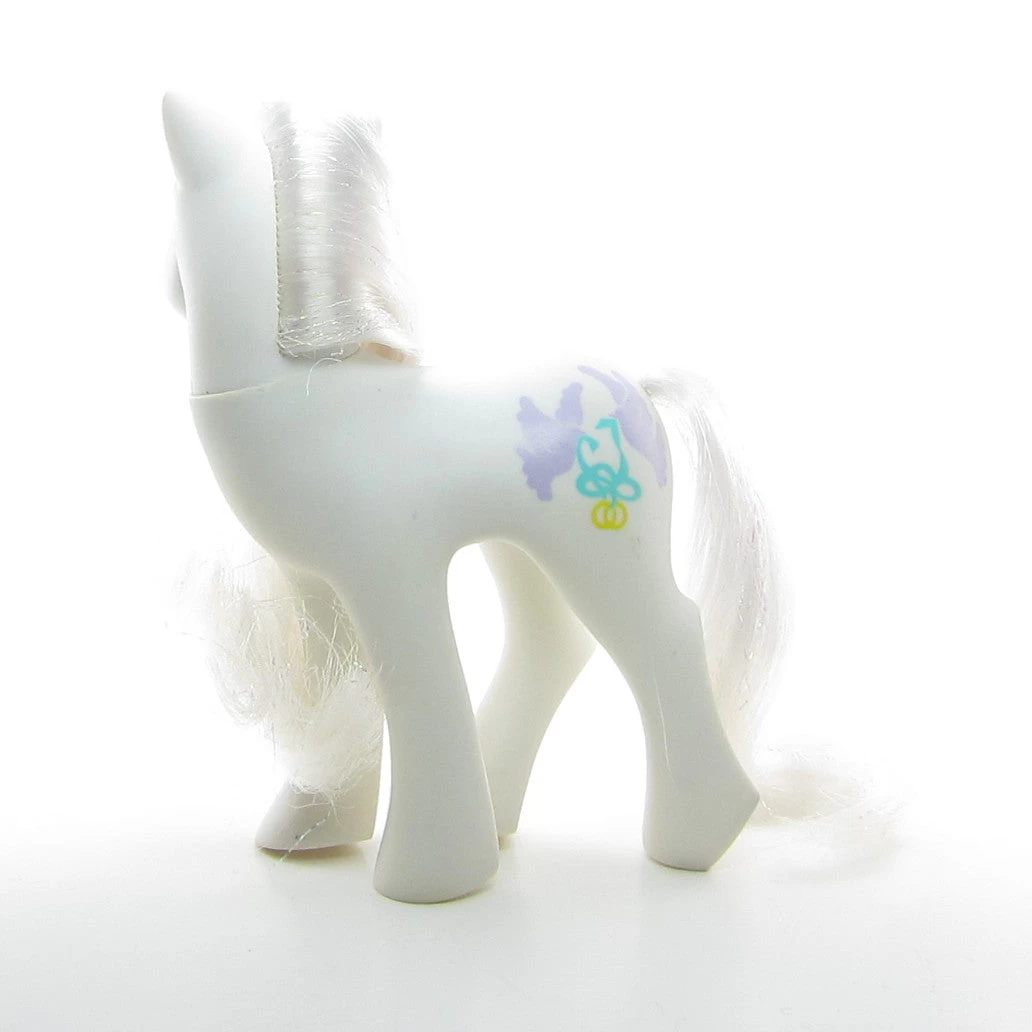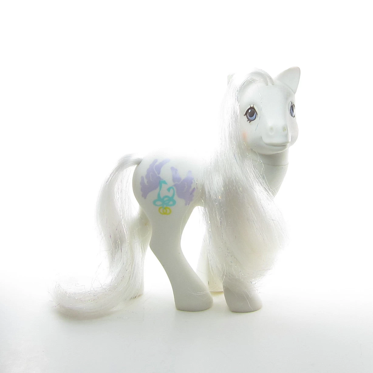 This vintage G1 My Little Pony is Pony Bride, she’s a white Earth pony that was released in Year 8 of the My Little Pony line. She has teal and purple doves and wedding rings for her symbol, and her hair is white with iridescent tinsel.
