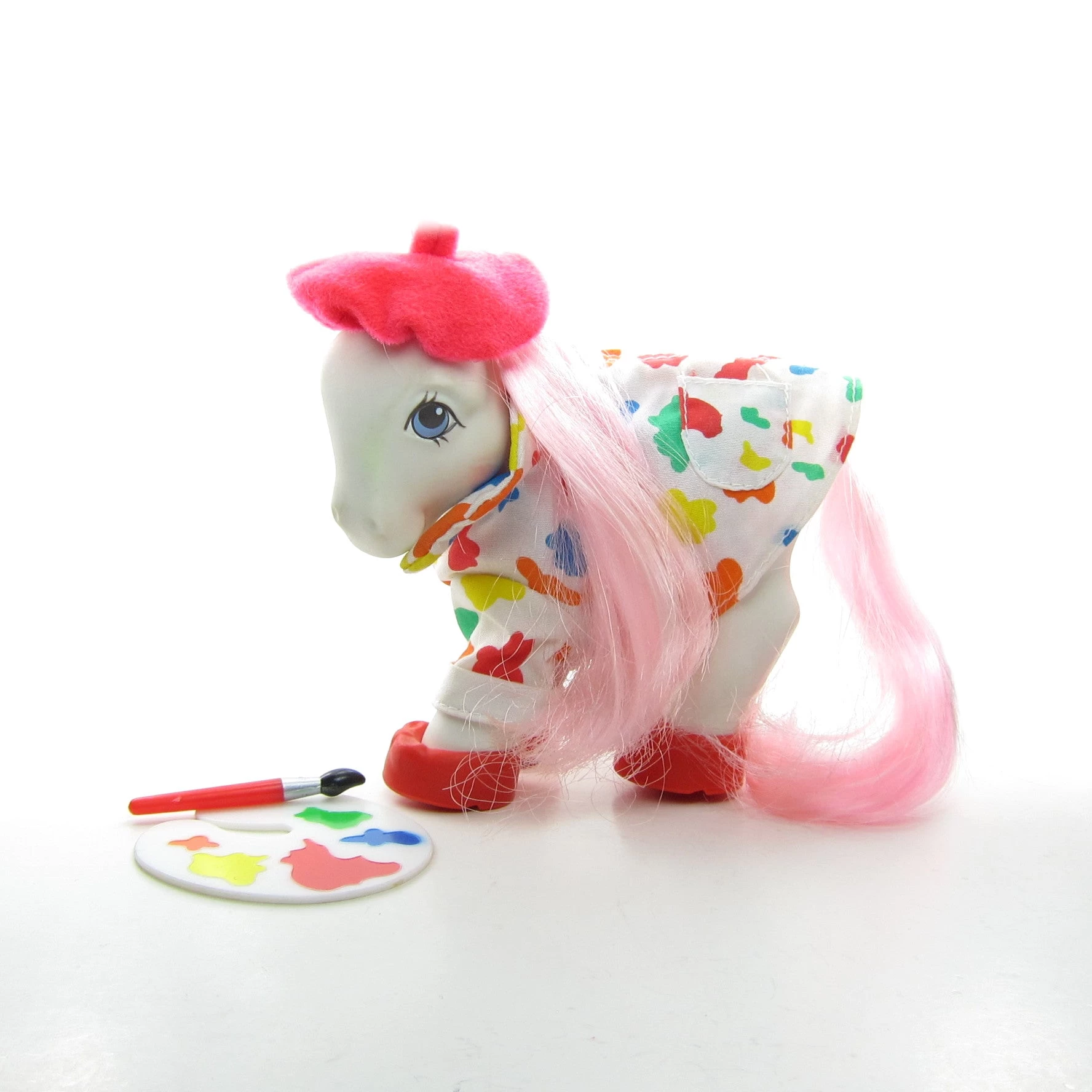 This vintage G1 My Little Pony outfit is the Pretty As A Picture Pony Wear set. It includes a white paint smock with colorful paint splatter, a soft red beret, red shoes, a paint palette, and a paintbrush. The set originally came with blue pants, but those are missing.