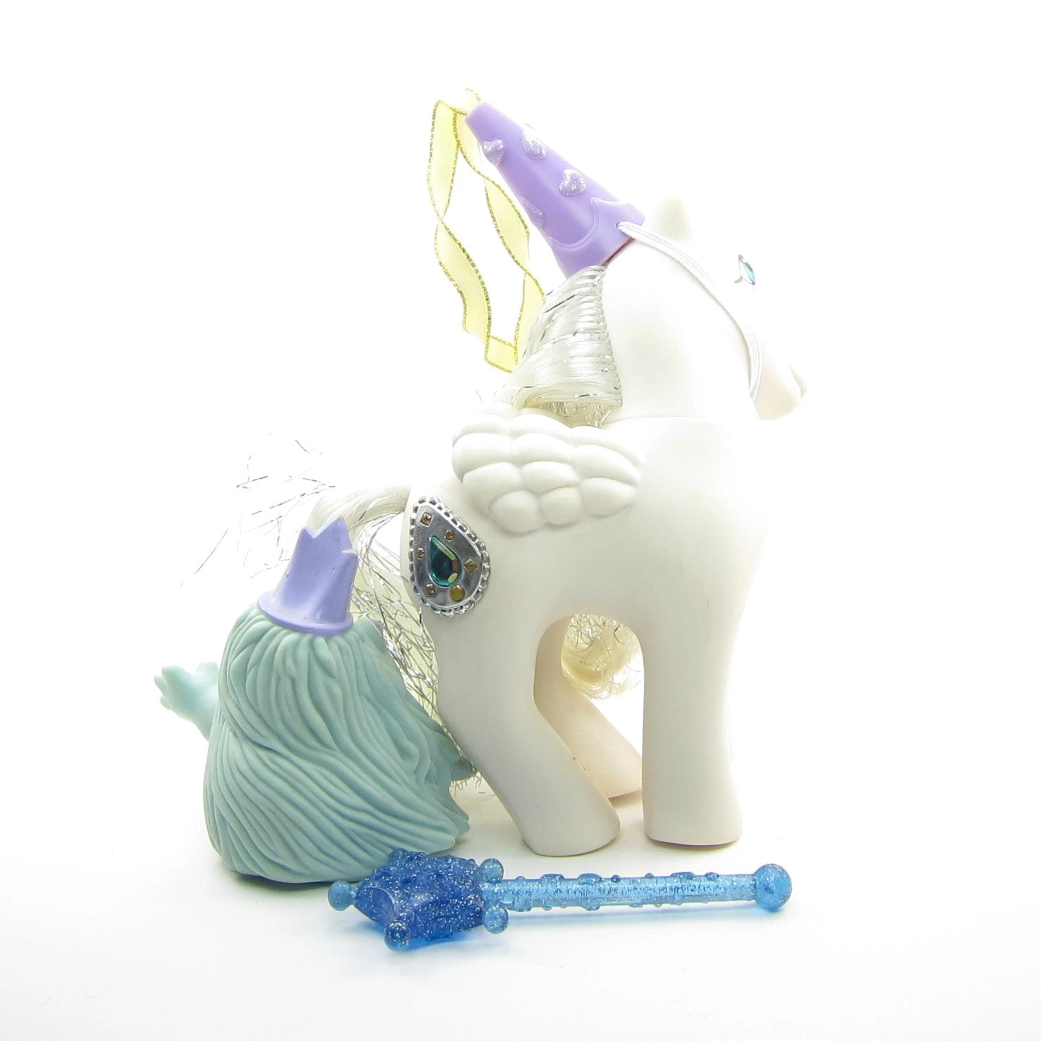 This vintage G1 My Little Pony is Princess Tiffany, she’s a Princess Pony from Year 5. Princess Tiffany (called Princess Pearl in the UK) is a white pegasus and has white hair with bits of silver tinsel added. Her symbol is a teardrop-shaped silver medallion with a smaller iridescent purple and green teardrop shape inside.