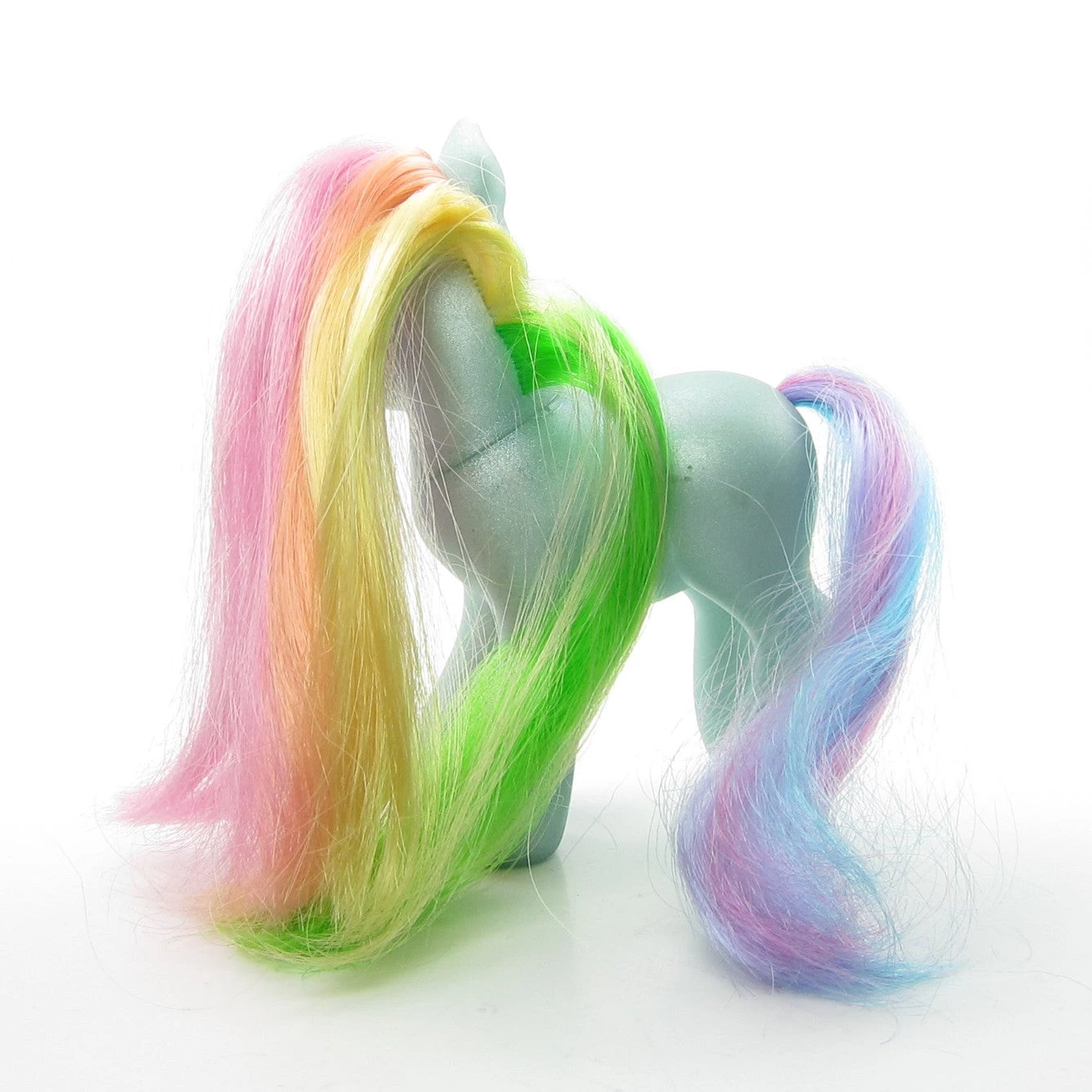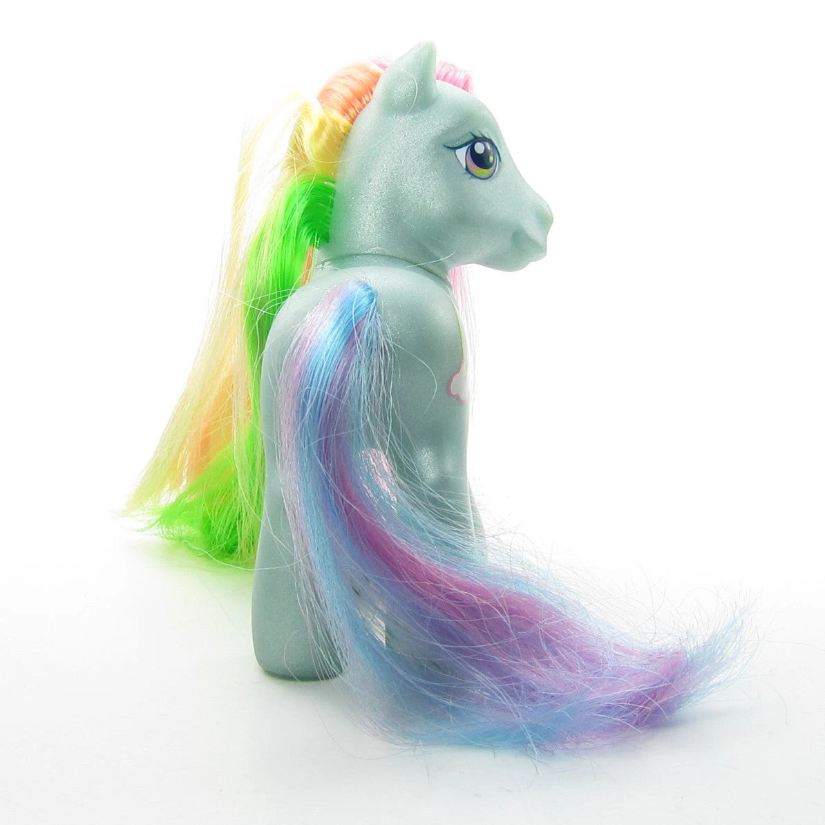 This My Little Pony is Rainbow Dash II, she’s from the second set of Rainbow Celebration Ponies from Year 1 of the G3 line. She has a pearlescent blue body, rainbow-colored eyes with a green heart, rainbow hair, and a rainbow with clouds for her symbol. She has a purple hoof heart on her front right leg and a magnet on the bottom of that hoof.