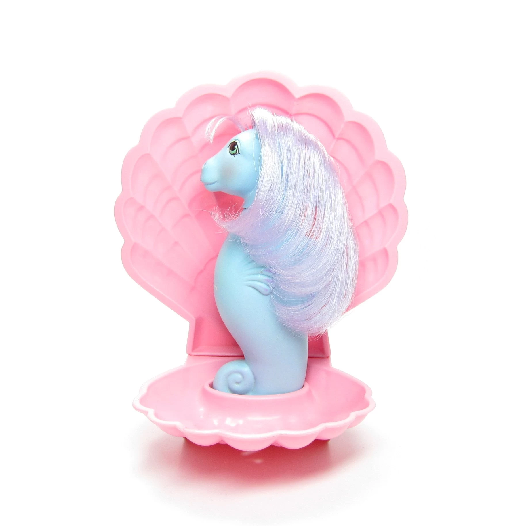 This vintage G1 My Little Pony Sea Pony is Seawinkle, she’s blue with a purple mane and has blue eyes. She comes with her original pink clamshell stand.