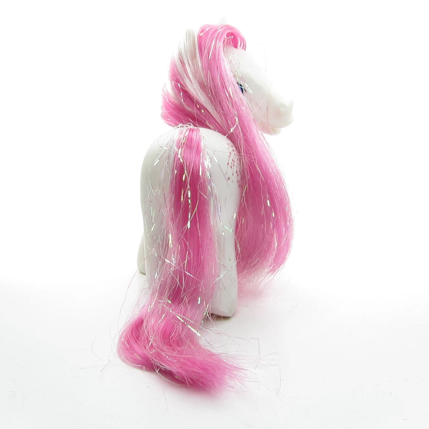 This My Little Pony is Star Swirl from Year 1 of the G3 line. She was originally sold in a promotion pack along with Sparkleworks or Minty. Star Swirl has a white body and pink hair with iridescent tinsel. Her eyes are blue with a purple star and her cutie mark is a swirl with red and silver stars. She has a dark pink hoof heart on her front right hoof and a magnet on the bottom of that hoof.