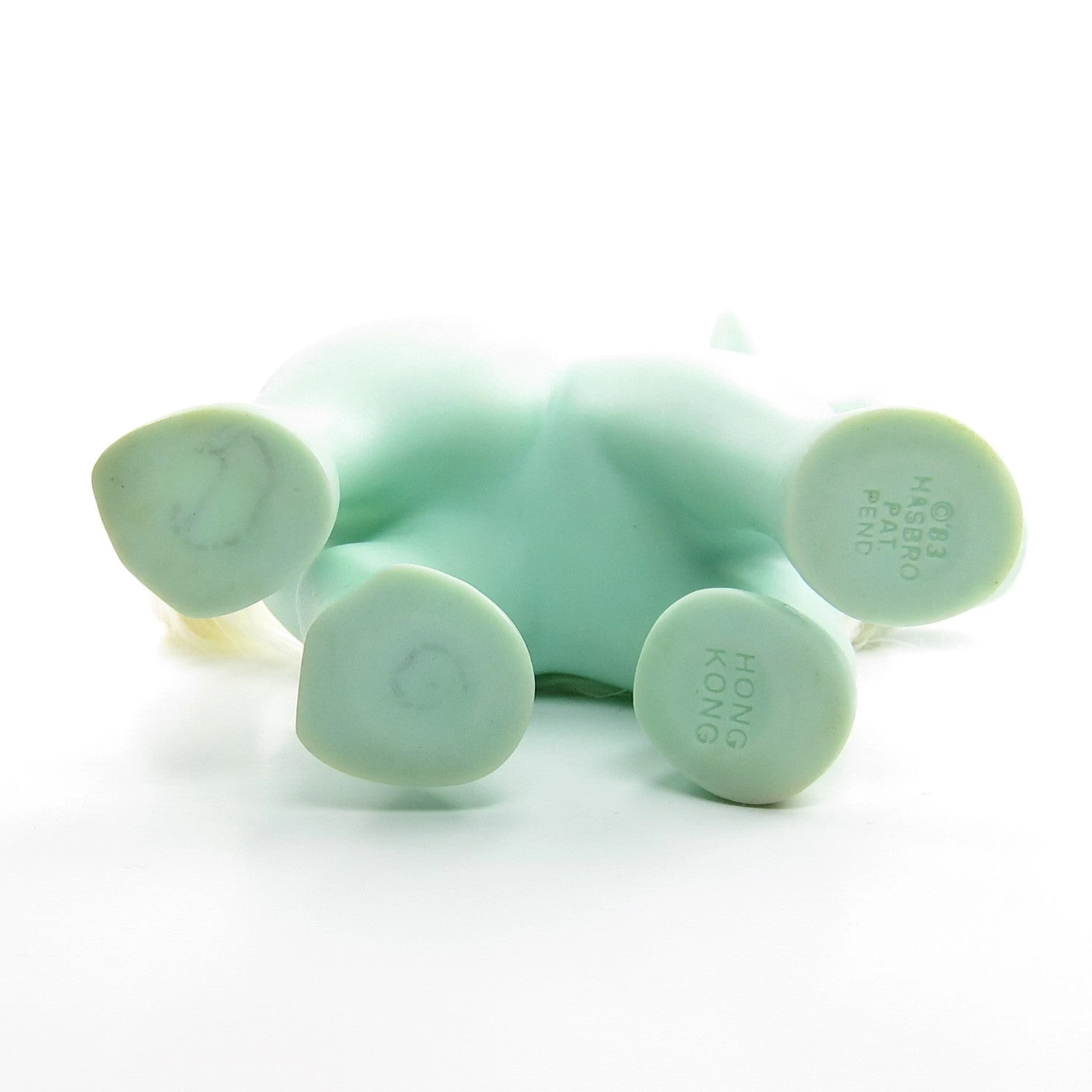 This vintage G1 My Little Pony is Sunbeam, she’s a unicorn pony from Year 2. She’s mint green with a white tail and a white mane with a yellow streak in it. Her symbol is a glittery gold sun, and she has blue eyes. She comes with her original yellow ribbon.