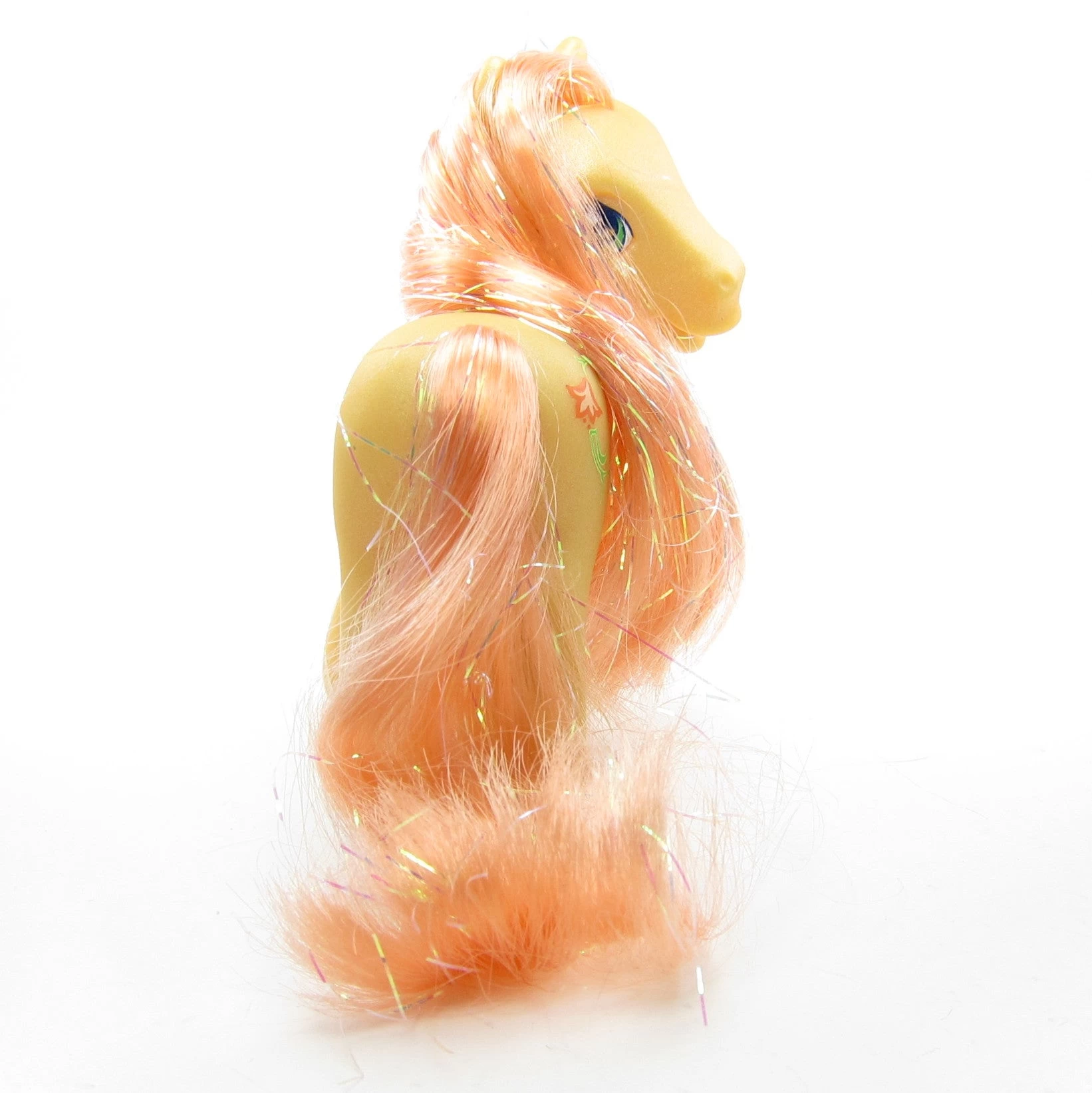 This My Little Pony is Sunset Sweety, she’s from the Perfectly Pony line from Year 2 of the G3 ponies. Sunset Sweety has a shimmery orange body and light orange hair with iridescent tinsel. Her eyes are green with a pink heart and her symbol has orange flowers and green leaves. She has an orange hoof heart on her front right hoof and a magnet on the bottom of that hoof.